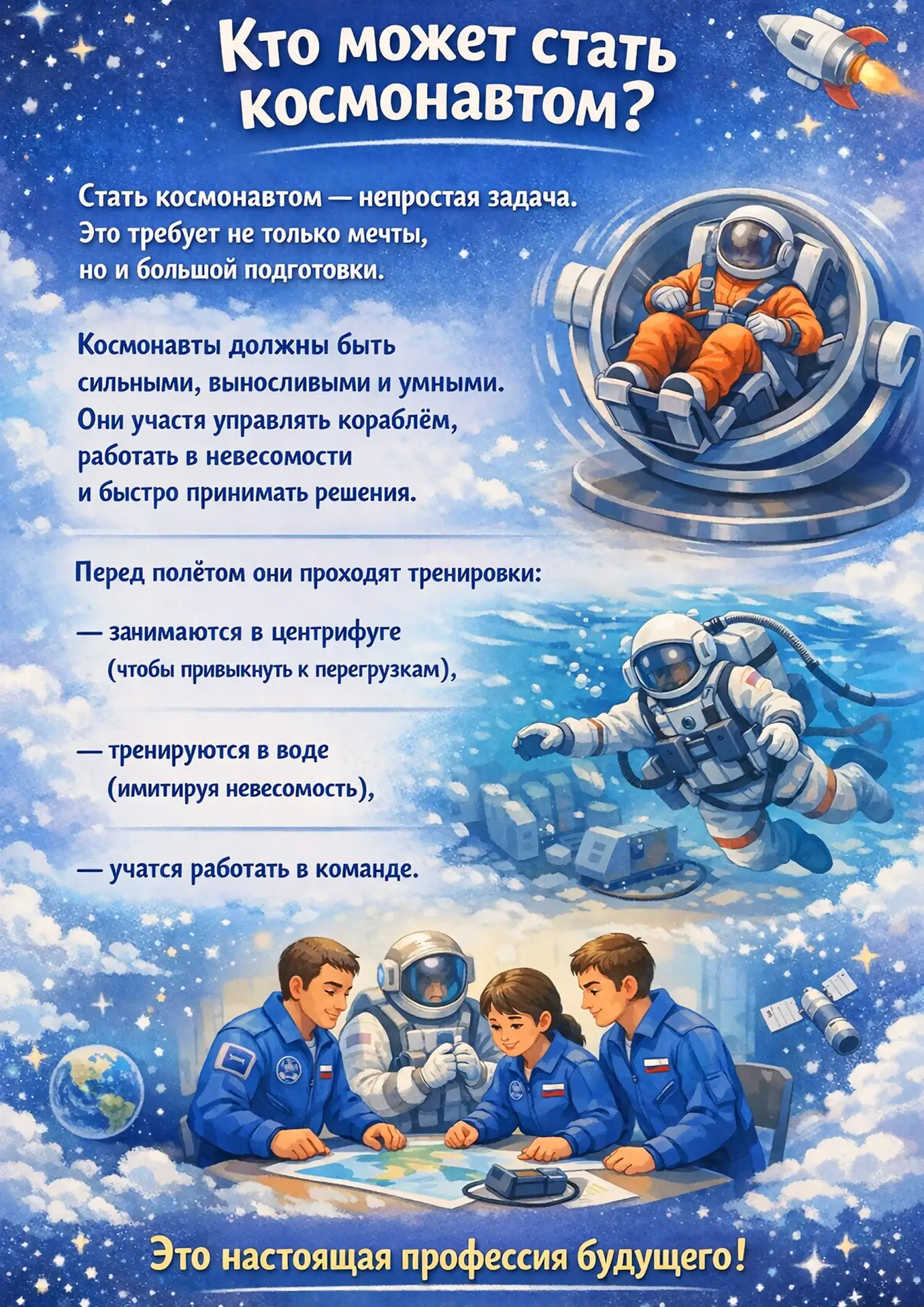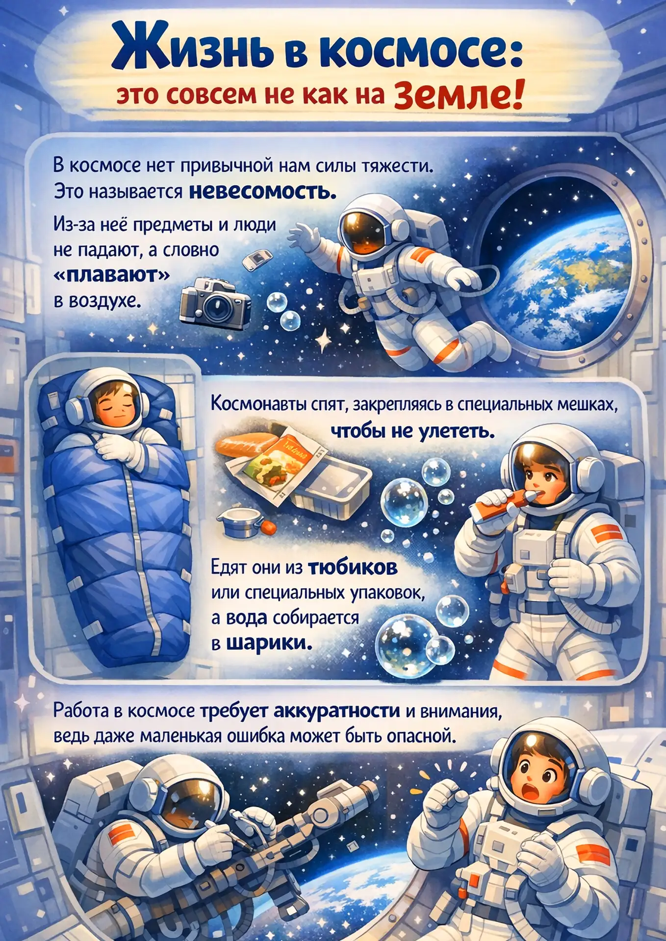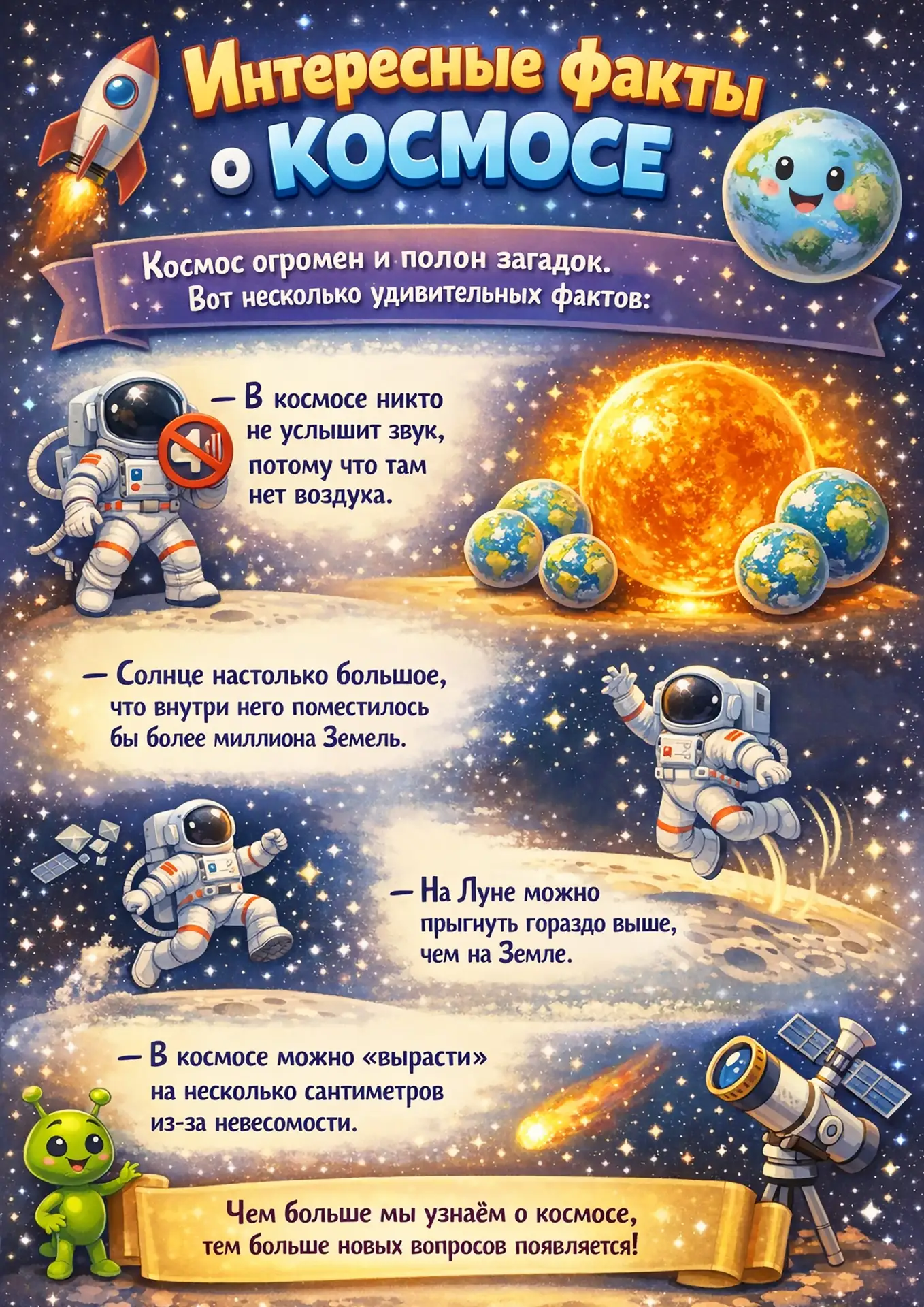 🔹 Яркие иллюстрации (космонавты, ракета, планеты, солнце)
