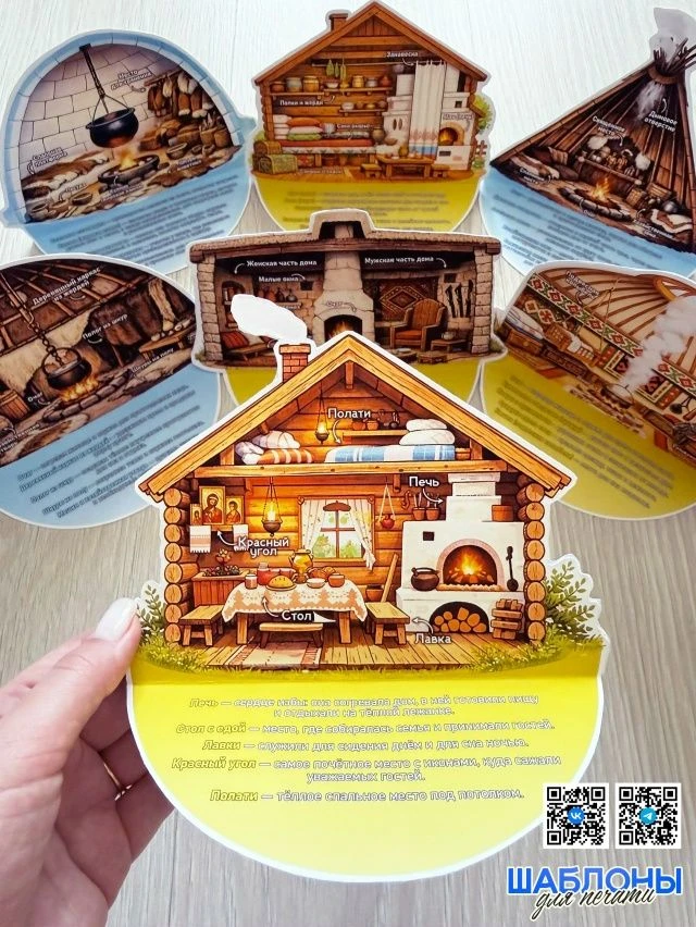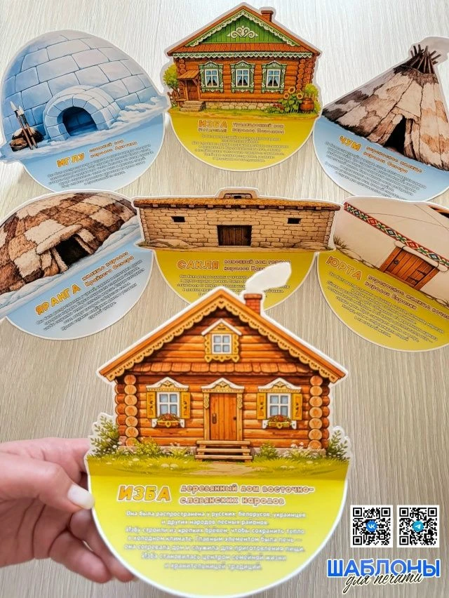 В наборе есть понятная инструкция — сборка простая, справляются даже младшие школьники. Готовые домики удобно использовать на уроке: поставить, рассмотреть, сравнить, обсудить. 12 видов жилищ (2 листа А4 на каждый домик — внутри и снаружи)