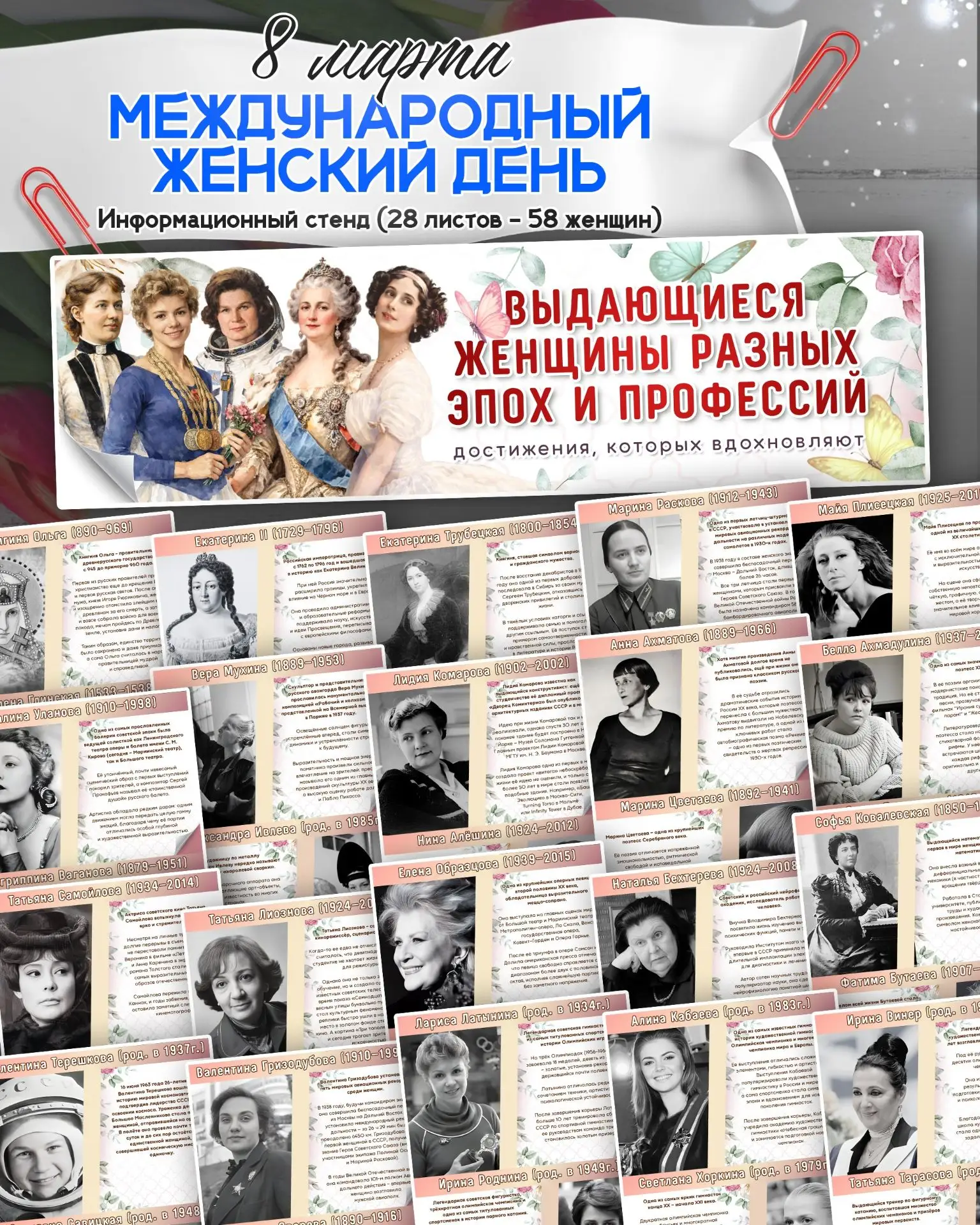 Делимся бесплатными информационными листами к 8 Марта «Выдающиеся женщины разных эпох и профессий». Напишите «СПАСИБО» в комментариях, если материал оказался полезным. Ваша обратная связь очень поддерживает и помогает выпускать больше качественных разработок Подготовили наглядный материал для оформления школы к Международному женскому дню. Листы можно использовать для стенда, классного часа, беседы или тематической выставки.