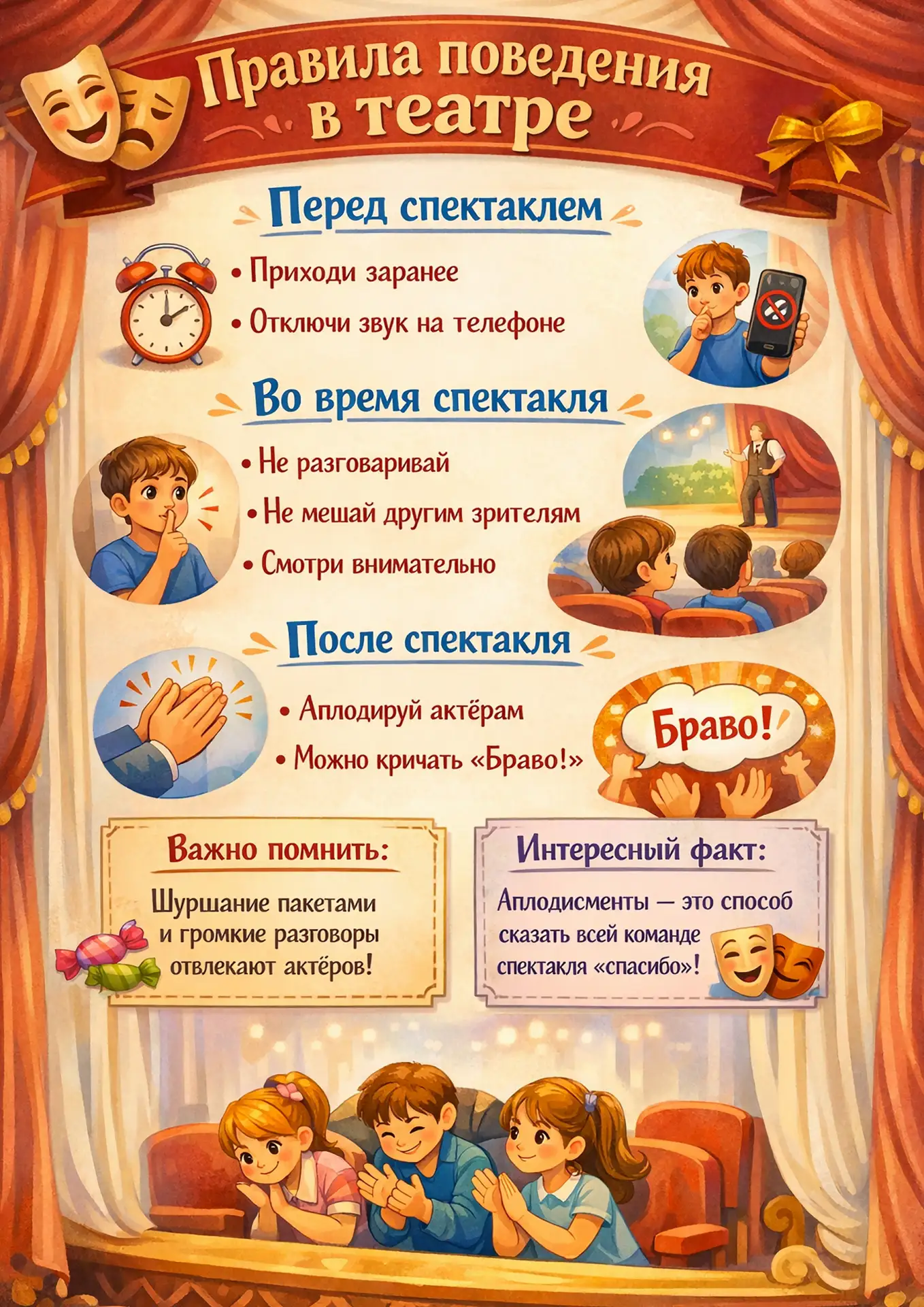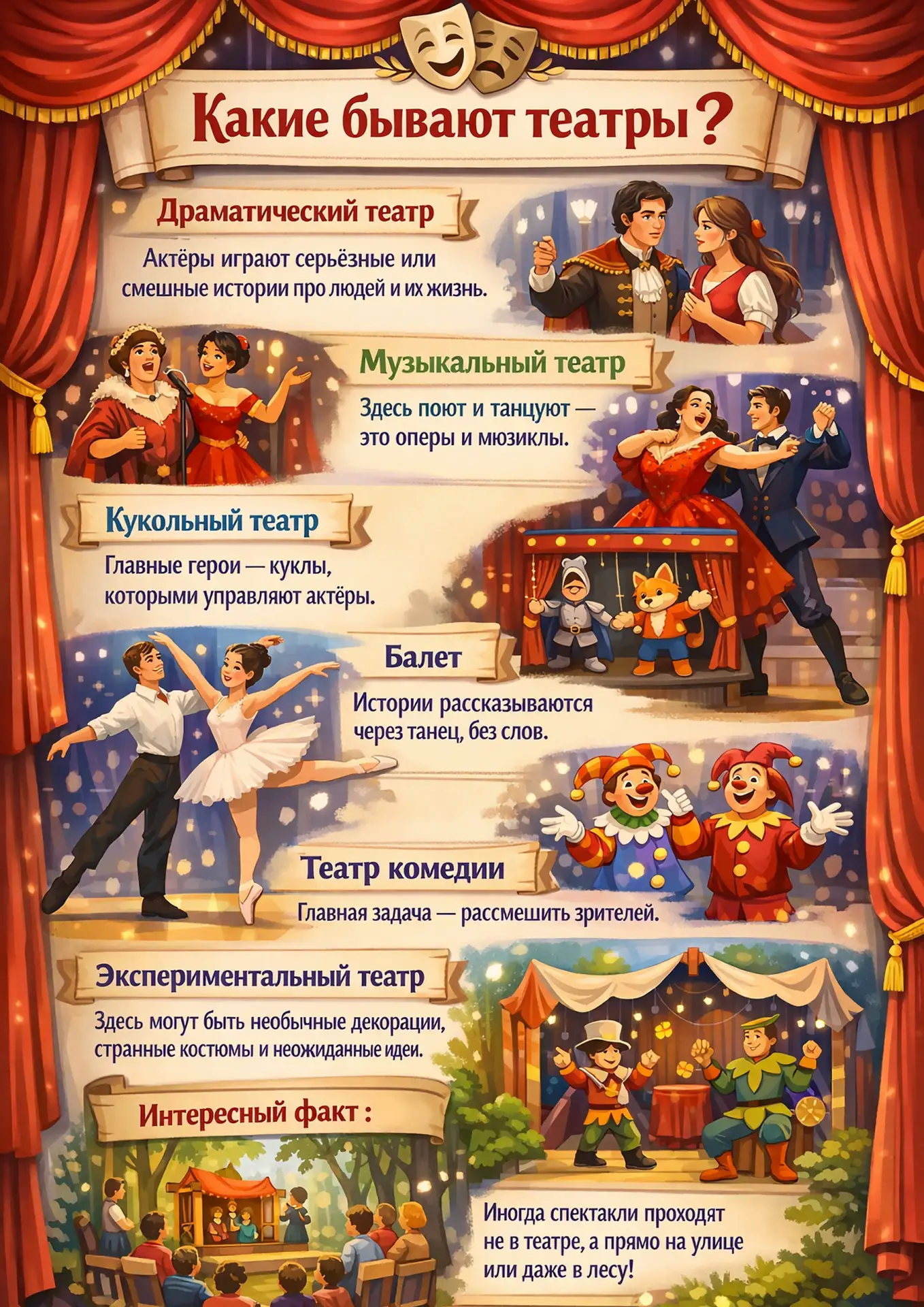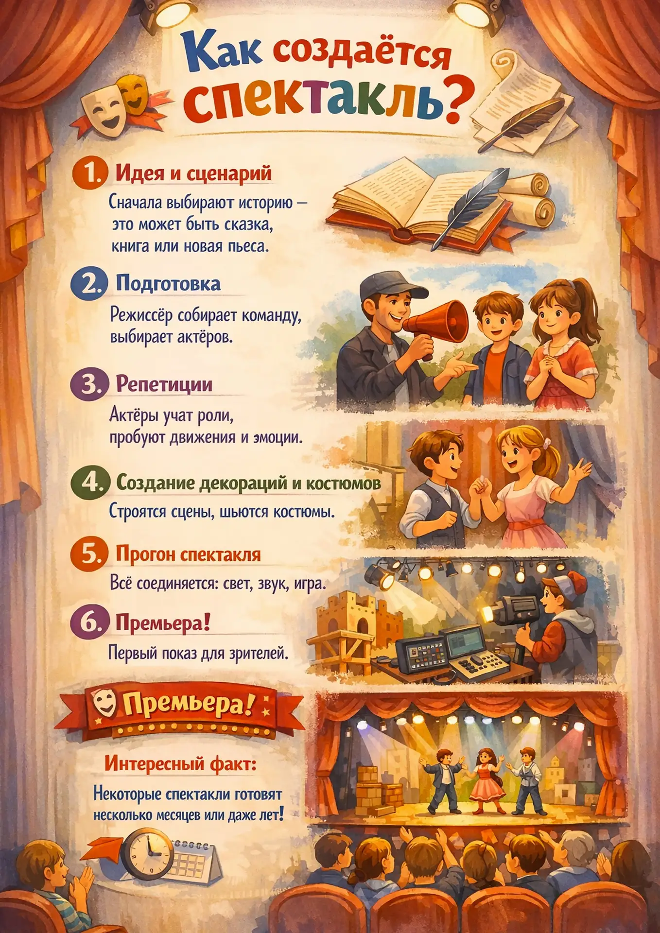 🔹 Яркие театральные элементы: маски, сцена, реквизит. Надписи и слоганы, декор для создания цельной композиции.