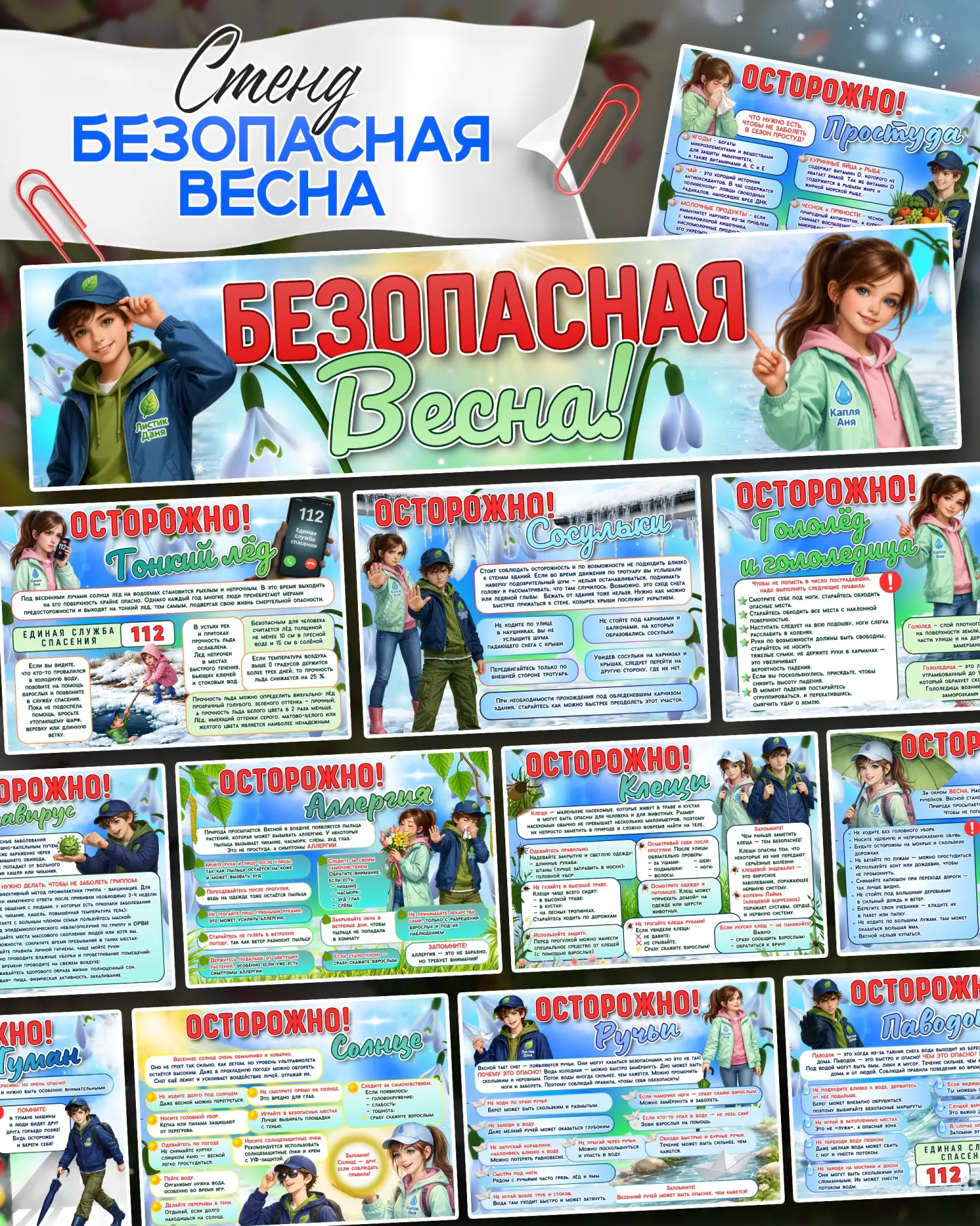 🔹 Карточки «Осторожно!» с разными темами: тонкий лёд, сосульки, гололёд и гололедица, паводок, клещи, аллергия, простуда, туман, солнце, ручьи, грипп и ОРВИ, дождь