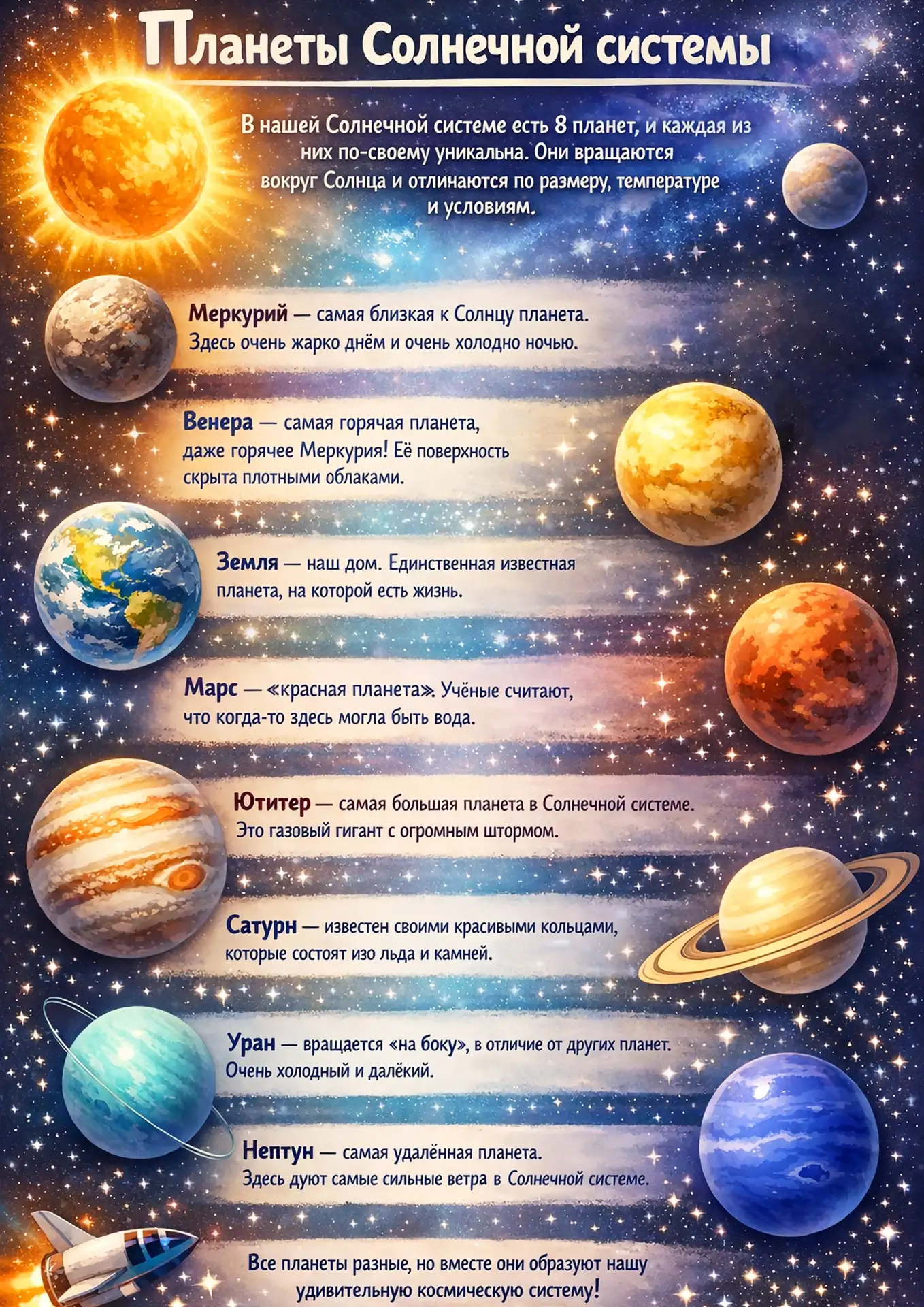Наш плакат поможет детям визуально запомнить порядок планет и их особенности.