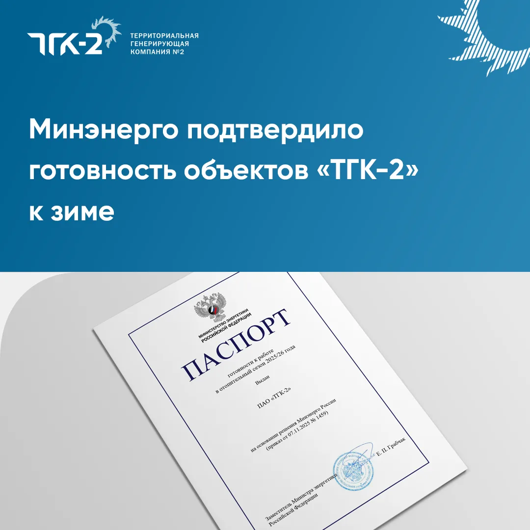 ПАО «ТГК-2» получило паспорт готовности к работе в отопительный сезон 2025–2026 годов. Паспорт подтверждает готовность производственных активов компании к несению осенне-зимних максимумов нагрузок. Решение оформлено приказом Министерства энергетики Российской Федерации от 07.11.2025 № 1459 «О результатах оценки готовности субъектов электроэнергетики в отопительный сезон 2025–2026 годов».