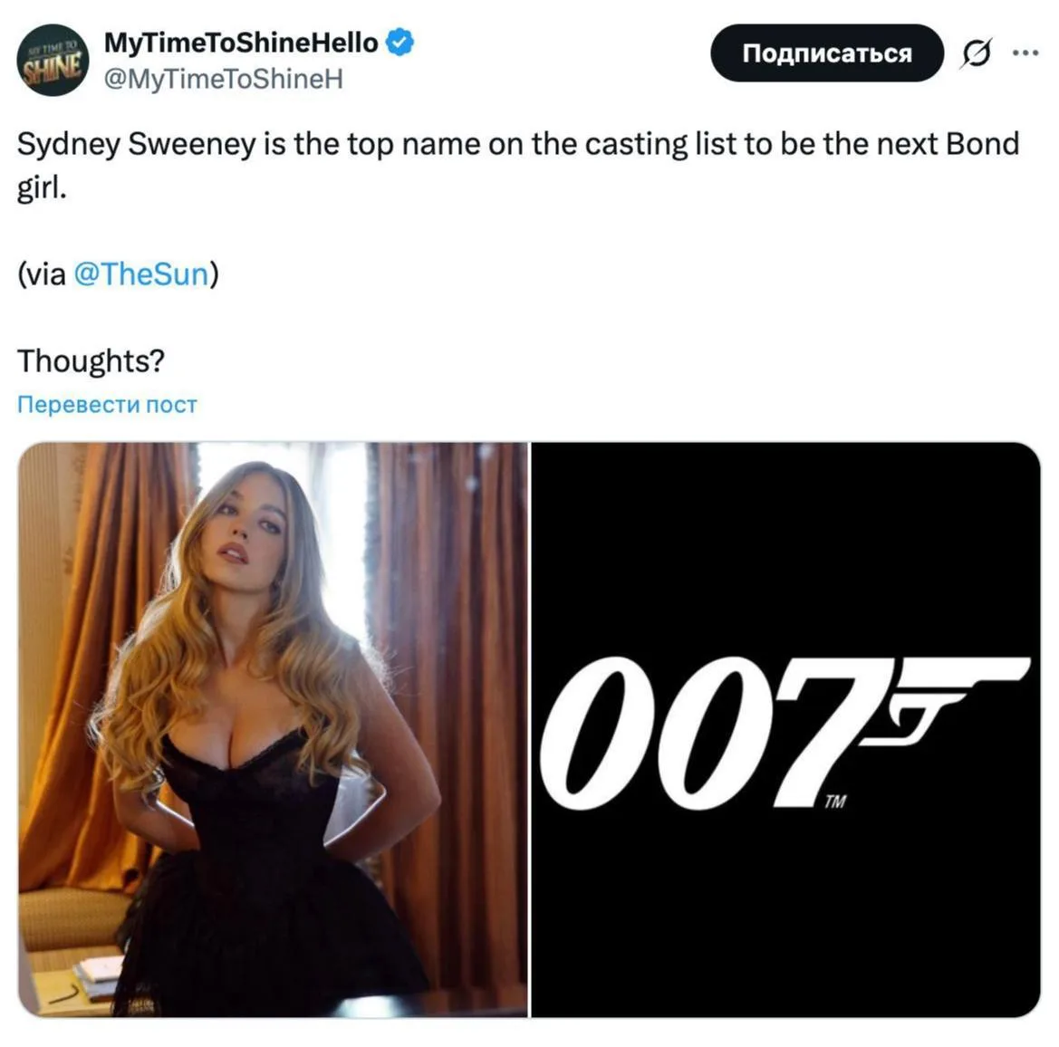 🎬 Сидни Суини сейчас главная претендентка на роль девушки Бонда в новом фильме, — пишет The Sun