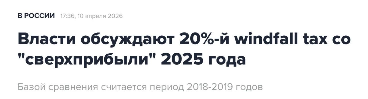 Власти обсуждают 20%-й windfall tax со «сверхприбыли» 2025 года....