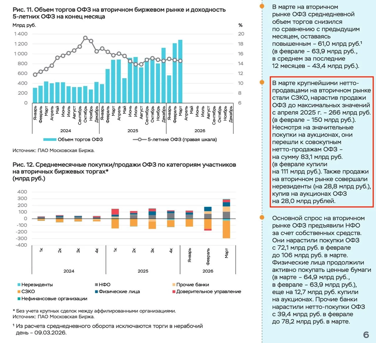 В марте крупнейшими нетто-продавцами на вторичном рынке стали СЗКО, нарастив продажи ОФЗ до максимальных значений с апреля 2025 г. – 266 млрд руб. (в феврале – 150 млрд руб.). Несмотря на значительные покупки на аукционах, они перешли к совокупным нетто-продажам ОФЗ – на сумму 83.1 млрд руб. (в феврале купили на 111 млрд руб.). — ОРФР ЦБ РФ