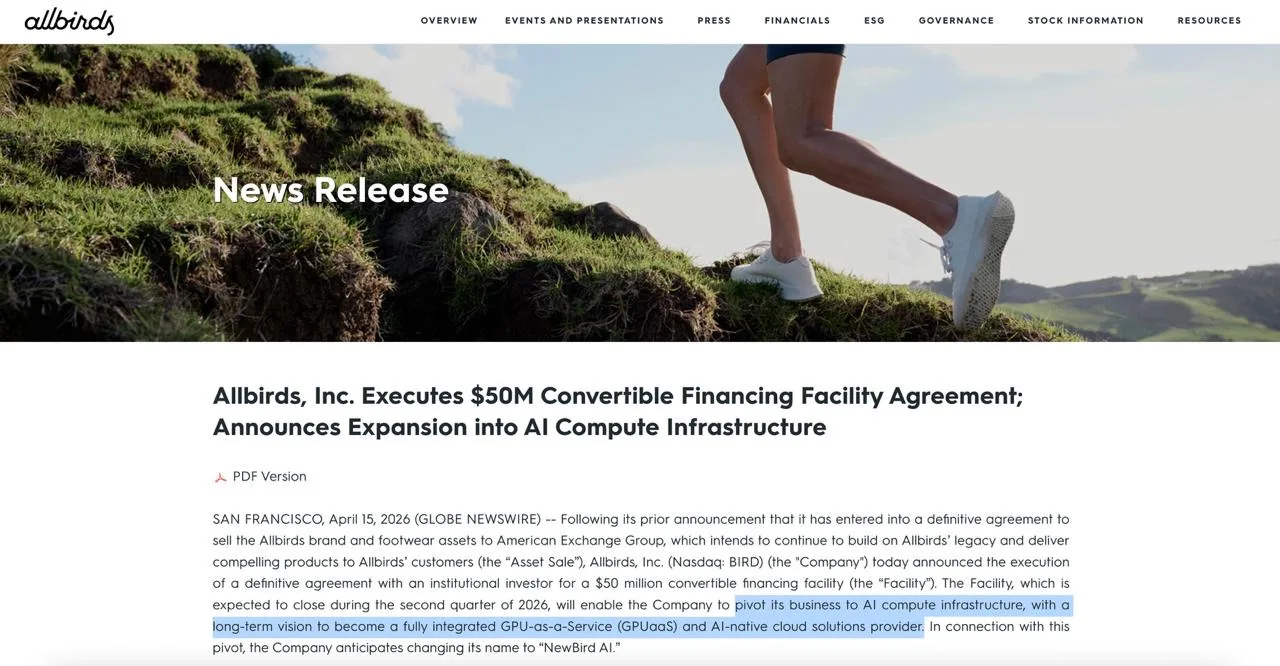 Ответ: просто взять и с нихуя объявить о том, что ваша компания теперь занимается не обувью, а «строит вычислительную инфраструктуру для ИИ» 👏