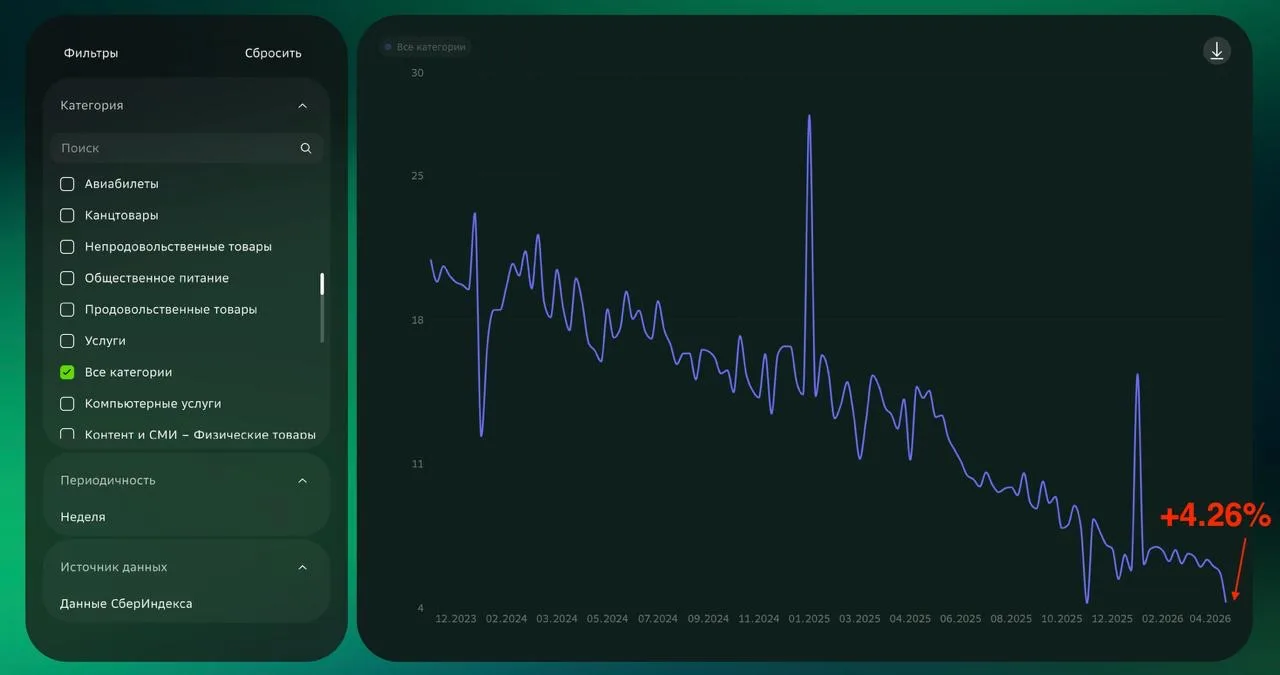 Судя по Сбериндексу (который считает изменение расходов потребителей год-к-году на основе транзакций клиентов Сбера), инфляция должна быть уже где-то у цели 🤔👆