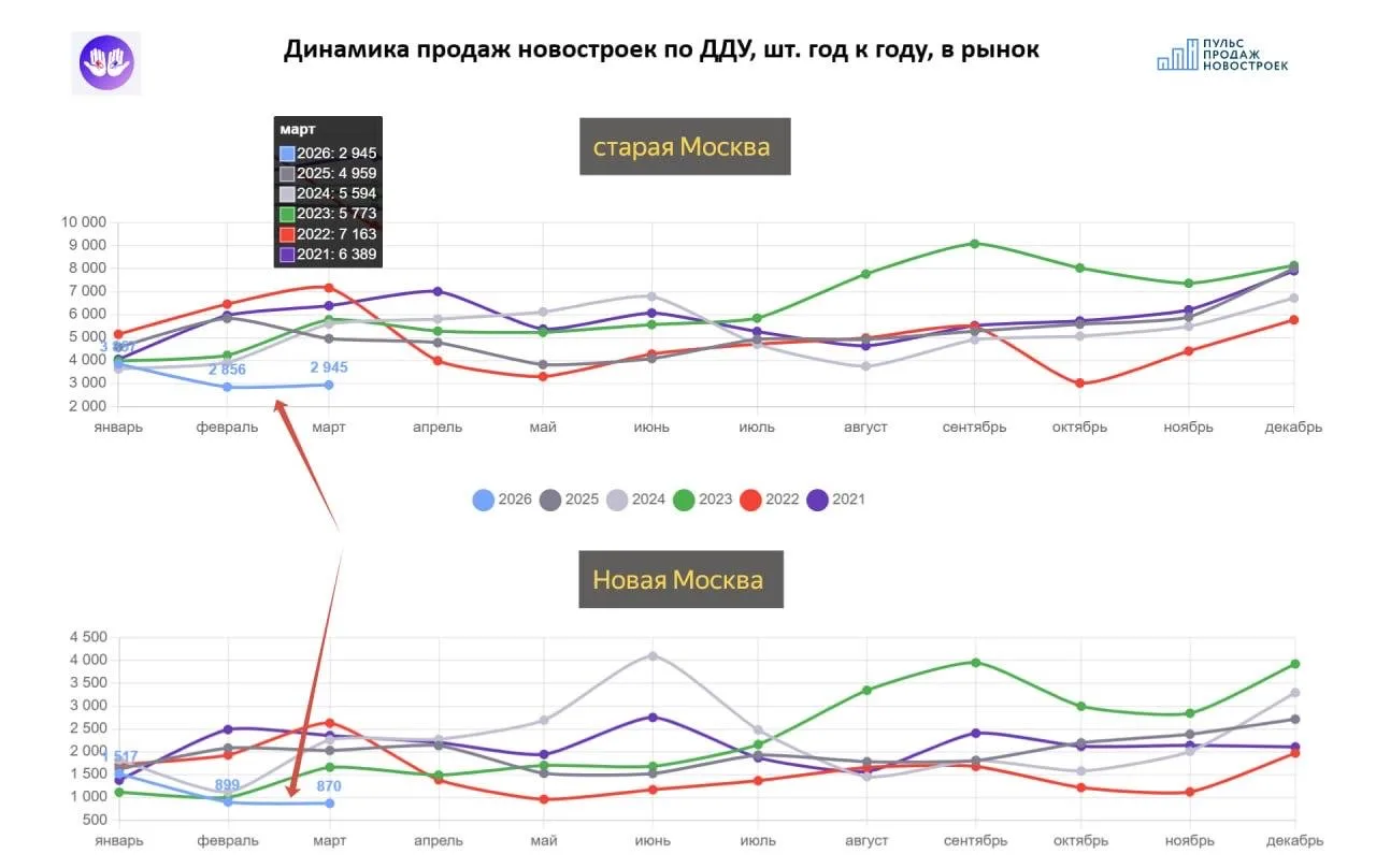 Продажи первичной недвижимости в Москве в марте - худший результат за последние 5 лет, -41% г/г в штуках, -23% г/г по выручке 👆