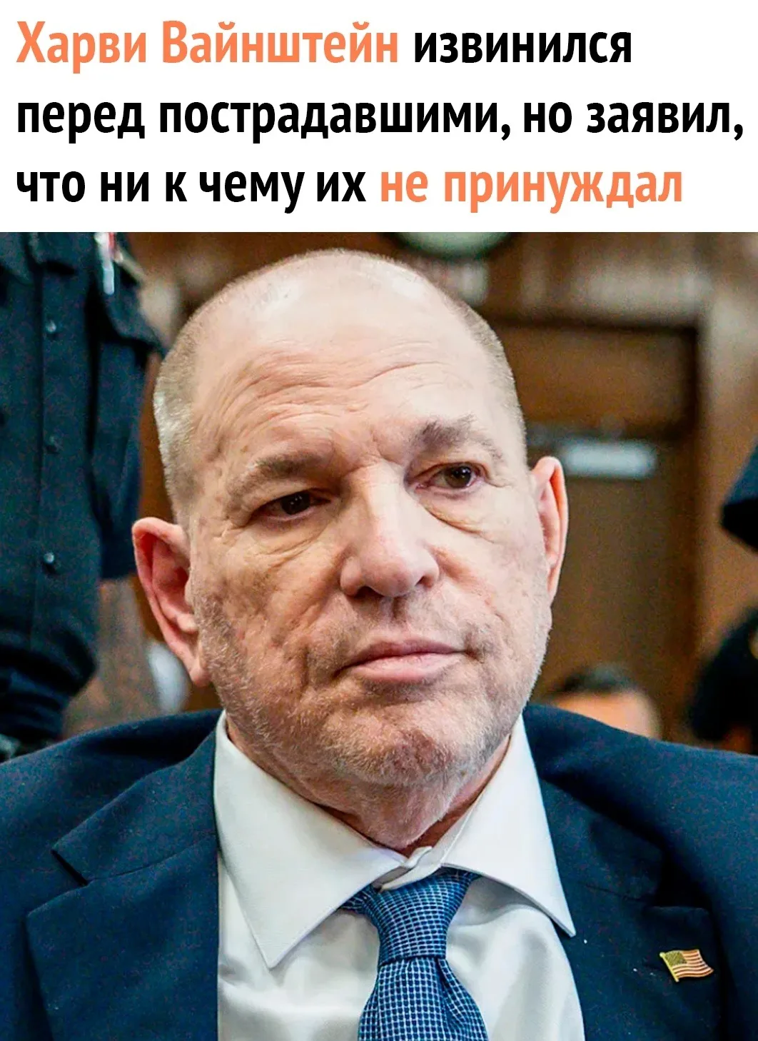 «Я принес извинения этим женщинам в общем виде. Невозможно связаться с ними лично, находясь в суде. Но сегодня я хочу публично сказать: я прошу прощения у этих дам. Мне очень жаль. Мне не следовало заводить с ними отношения с самого начала. Я обманул их. Я изменял обеим своим женам. Это неправильно. Но я не нападал на них. Это крупная ложь. Я не стану извиняться за то, чего не совершал. Я останусь невиновным. Обещаю», — заявил Вайнштейн.
