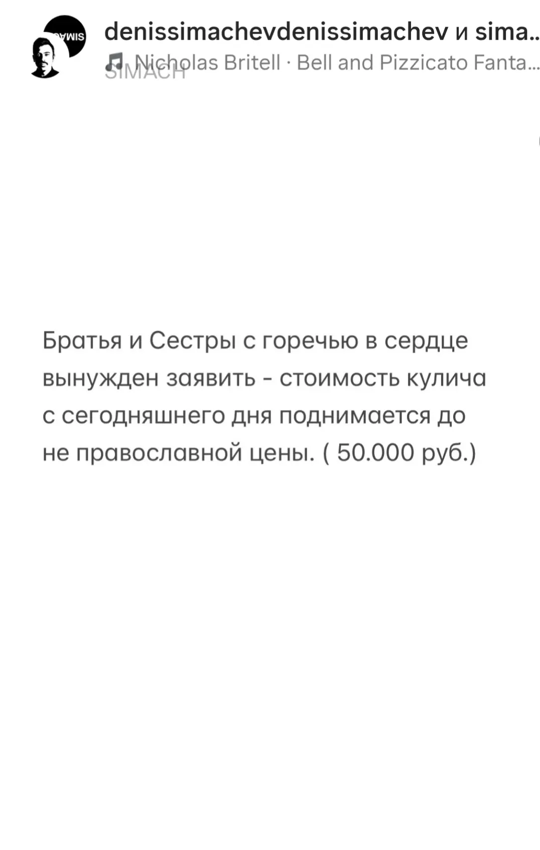 С куличами сегодня тоже не везет не без новостей: ресторатор Денис Симачев вот объявил, что стоимость его завирусившихся «хрустальных» куполов из карамели поднимается до «неправославных» 50 тысяч рублей. А ведь пару дней назад было 35, мы проверяли!