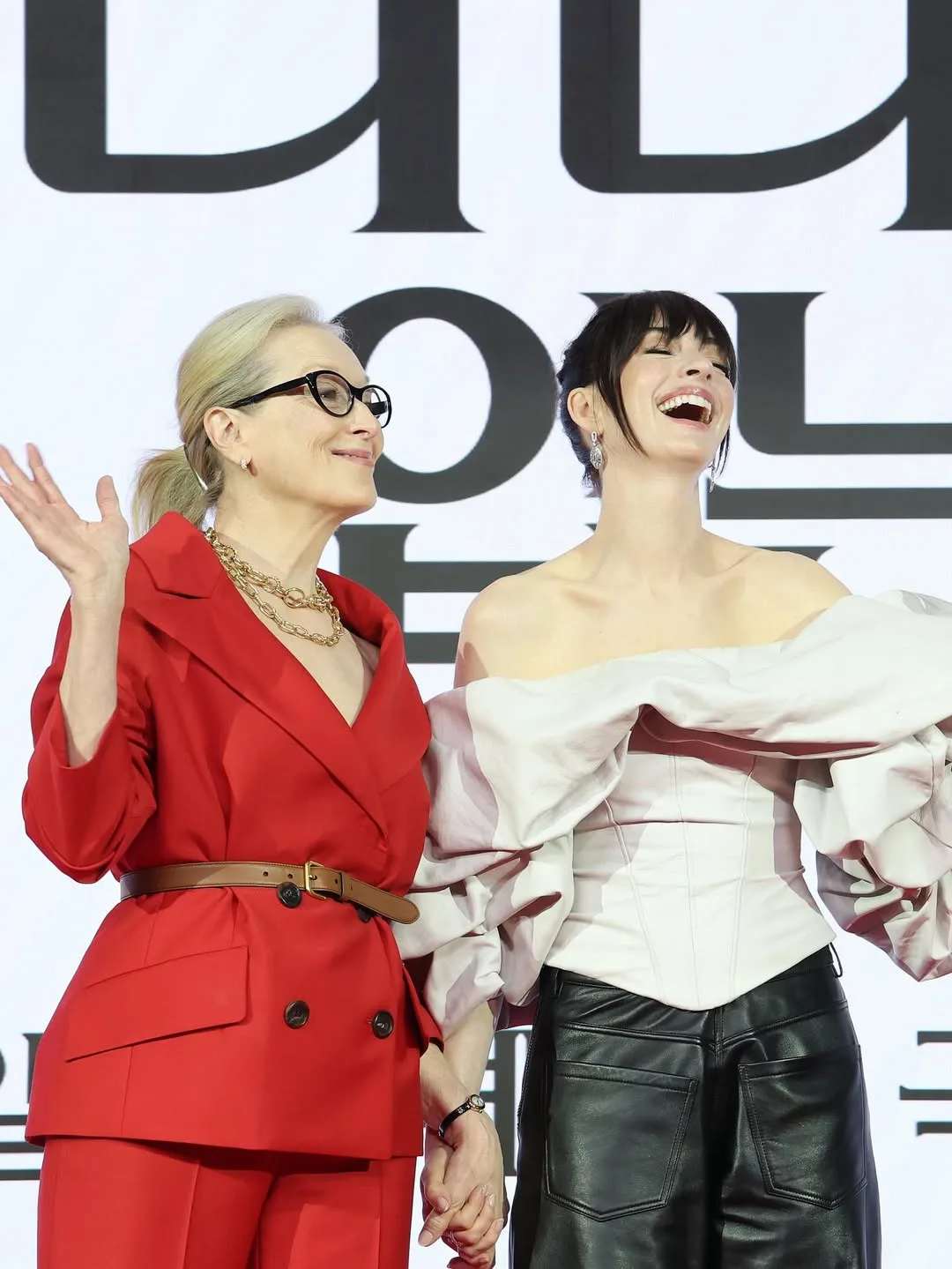 Тем временем Мерил Стрип и Энн Хэтэуэй уже в Южной Корее: красотки представили «Дьявол носит Prada 2» в Сеуле, традиционно примерив любимый кутюр❤