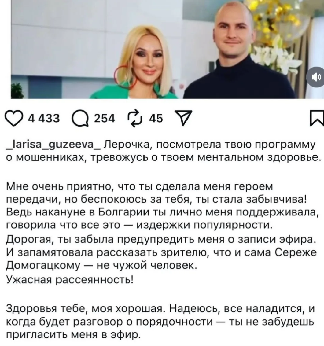 Все из-за выпуска шоу телеведущей, в котором говорилось об участии Гузеевой в мошеннической схеме с продажей вилл на Бали. Лариса посмотрела передачу подруги и напомнила той, что она и сама рекламировала эти виллы.