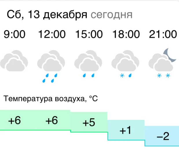 14-15 декабря ожидается дождь с мокрым снегом, переходящий в снег. На дорогах образуется гололёд, а на проводах и деревьях может налипнуть снег. Ночью будут заморозки — –3…–5 °С.