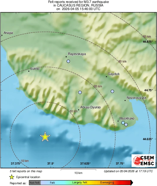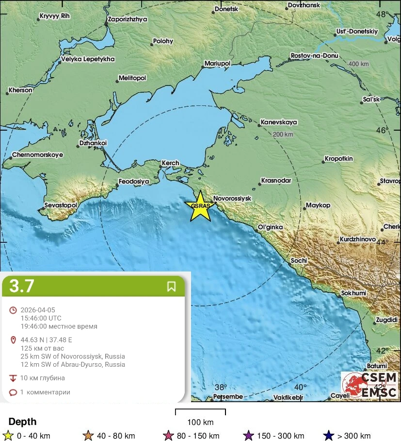 В акватории Черного моря в 32 км на юго-восток от береговой линии Анапы произошло землетрясение