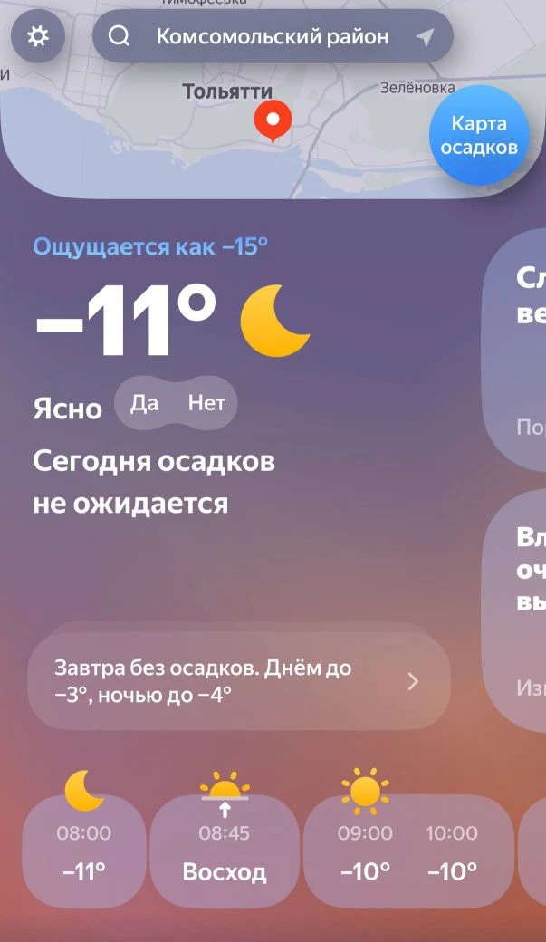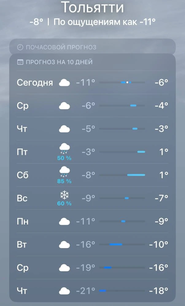 В Тольятти сегодня пасмурно, без осадков. Ветер южный 7м/с. Температура воздуха теплее вчерашнего дня, - 6...-4 °C.