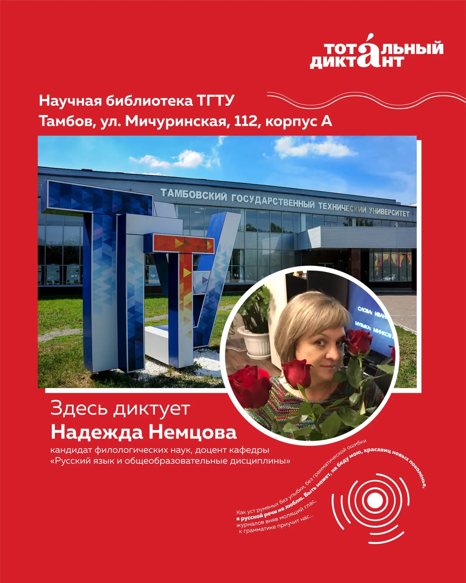 ✍️ 18 апреля в 14:00 Тамбовский государственный технический университет вновь станет одной из площадок масштабной просветительской акции «Тотальный диктант». В этом году проверить свою грамотность можно в научной библиотеке вуза. Продиктует текст кандидат филологических наук, доцент кафедры «Русский язык и общеобразовательные дисциплины» Надежда Немцова.