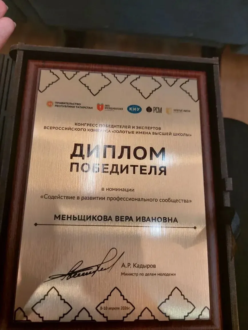 Вера Меньщикова - победитель конкурса в 2023 году, с 2024 года - эксперт конкурса. В рамках конгресса 2026 года она вошла в число лучших среди победителей и экспертов конкурса «Золотые имена высшей школы».