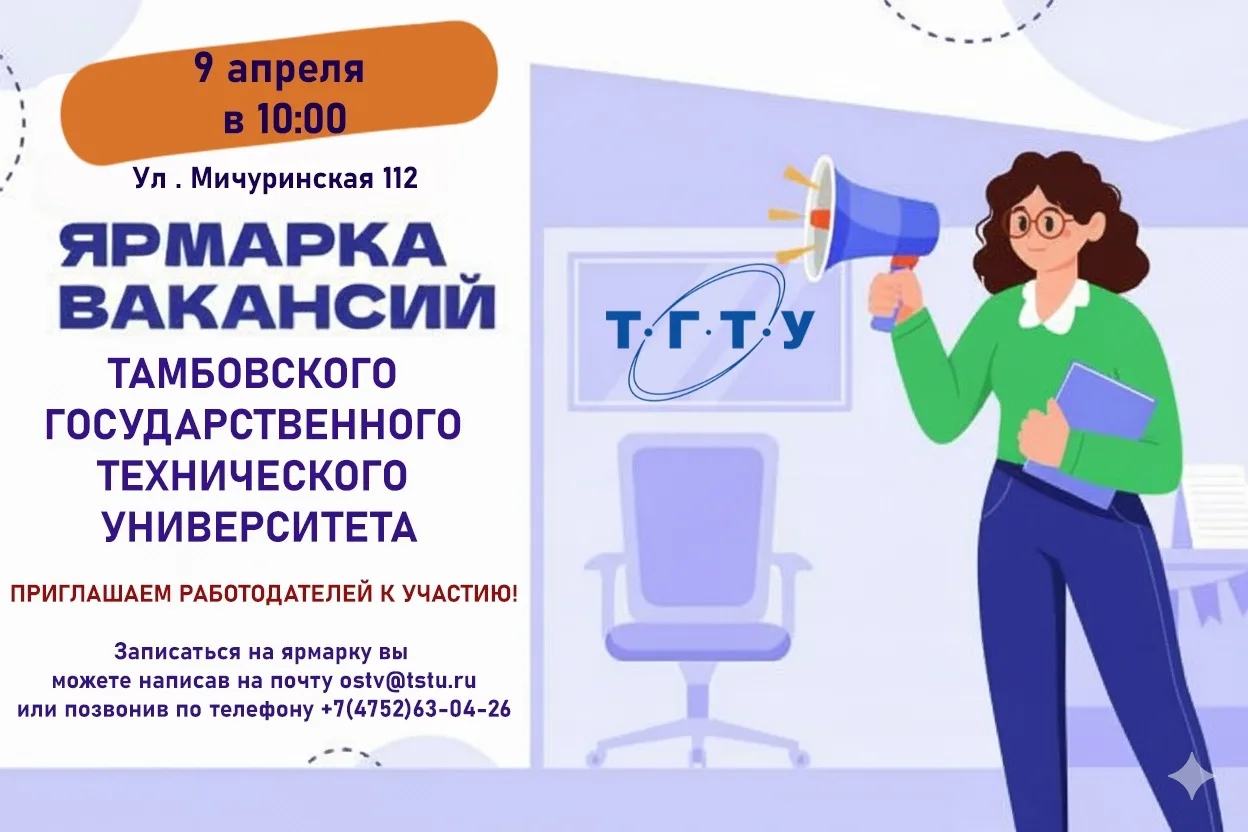 👨💼 Внимание старшекурсникам и выпусникам ТГТУ! Если после Ярмарки вакансий, прошедшей 9 апреля в нашем университете, у вас остались вопросы к работодателям и желание дополнително ознакомиться с вакансиями в регионе, то 17 апреля в Тамбове (ТГУ, корпус на ул.Советская, 6) пройдет региональный этап Всероссийской ярмарки трудоустройства "Работа России". Время возможностей». Ярмарка будет работать с 10 до 13 часов.