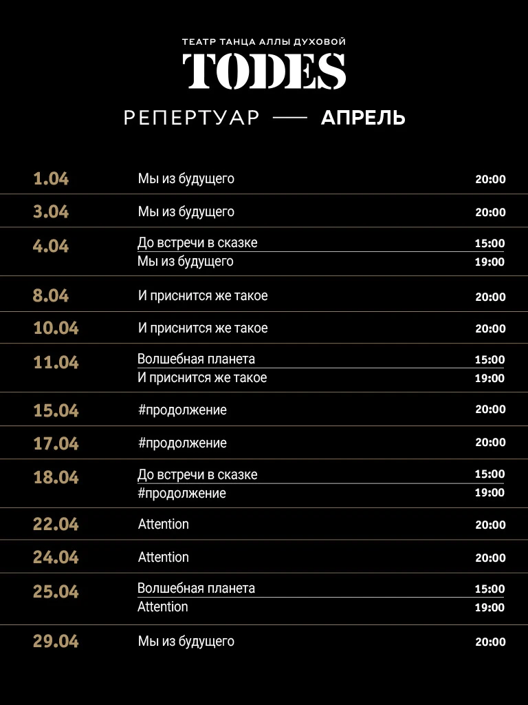 В апреле Театр Аллы Духовой TODES приглашает вас в удивительный мир танца - полный волшебства, ярких красок и незабываемых эмоций!