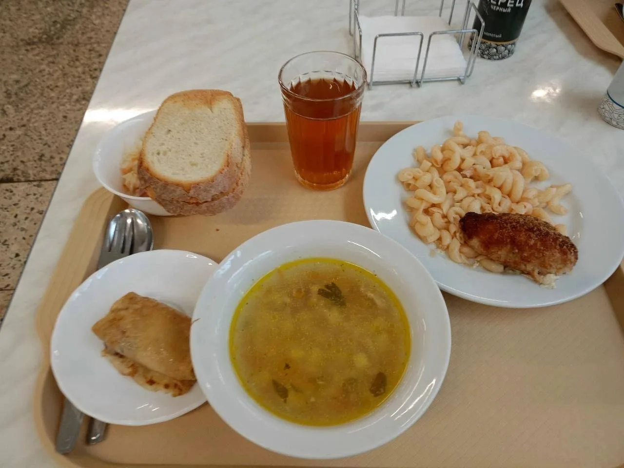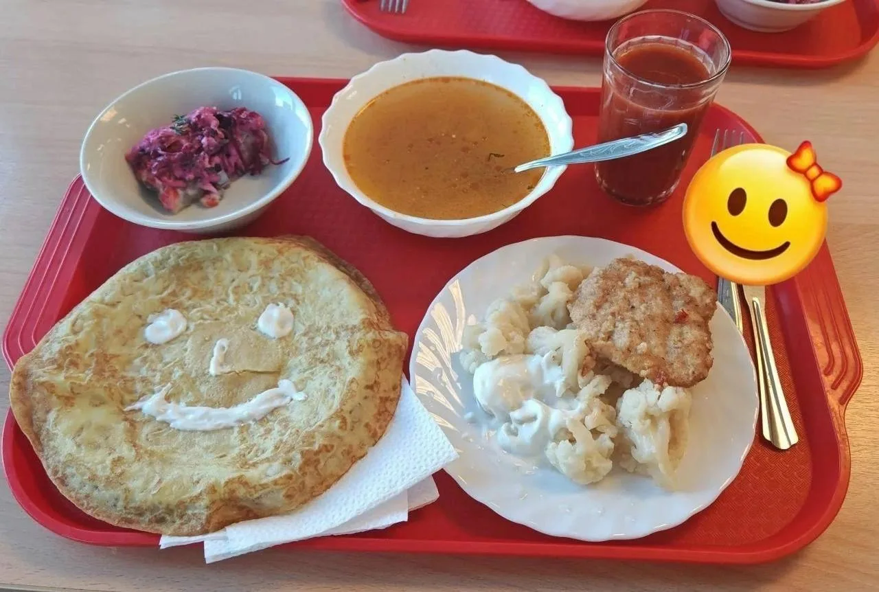 В столовых классика: пюрешка с котлеткой, рыбный день, свежие салаты. А раз Масленица — повара каждый день пекут блины.