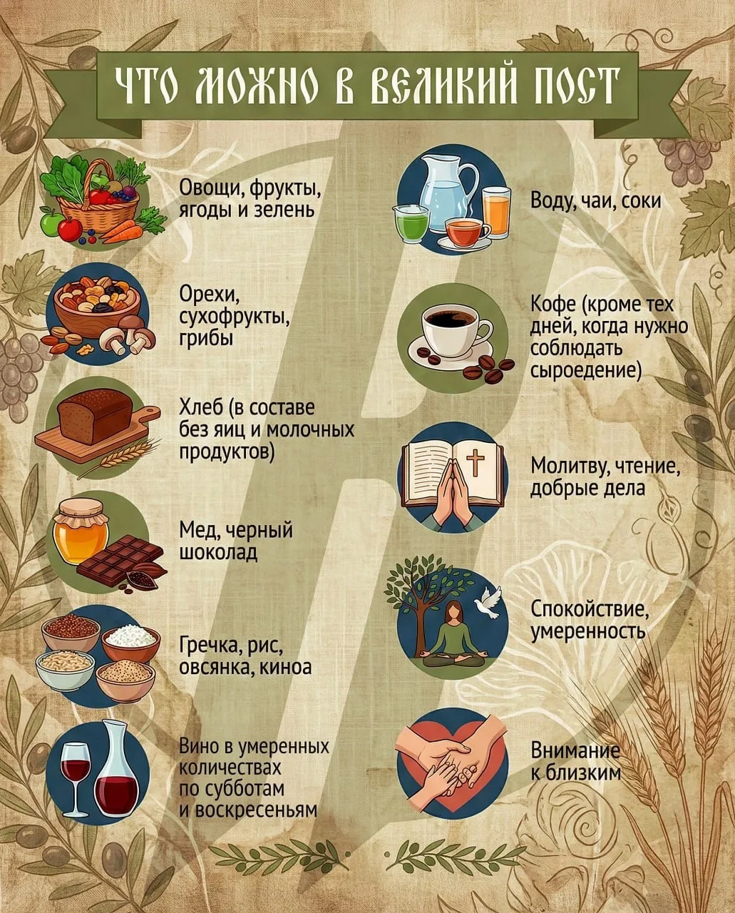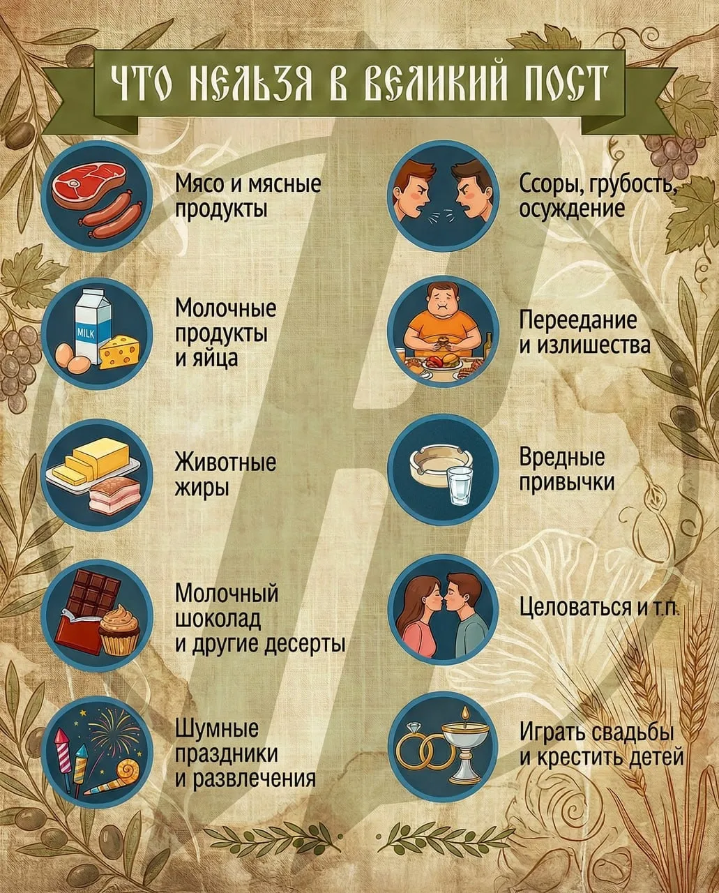 Однако церковь подчеркивает, что смысл поста не ограничивается едой. В это время не рекомендуется устраивать ссоры, предаваться праздным развлечениям и поддаваться раздражению, также стоит забыть пагубные привычки. Великий пост призван стать временем тишины, внимания к ближним и осознанной подготовки к Пасхе.
