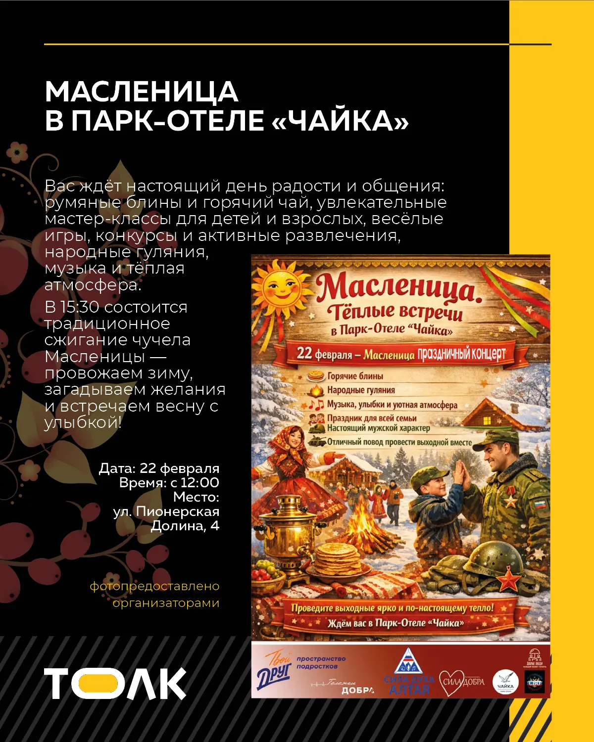 А теперь о погоде: 22 февраля в Алтайском крае температура воздуха будет в среднем -11...-16 градусов, в южных районах — около -2...-7 градусов. Местами небольшой, по югу умеренный снег и слабые метели.