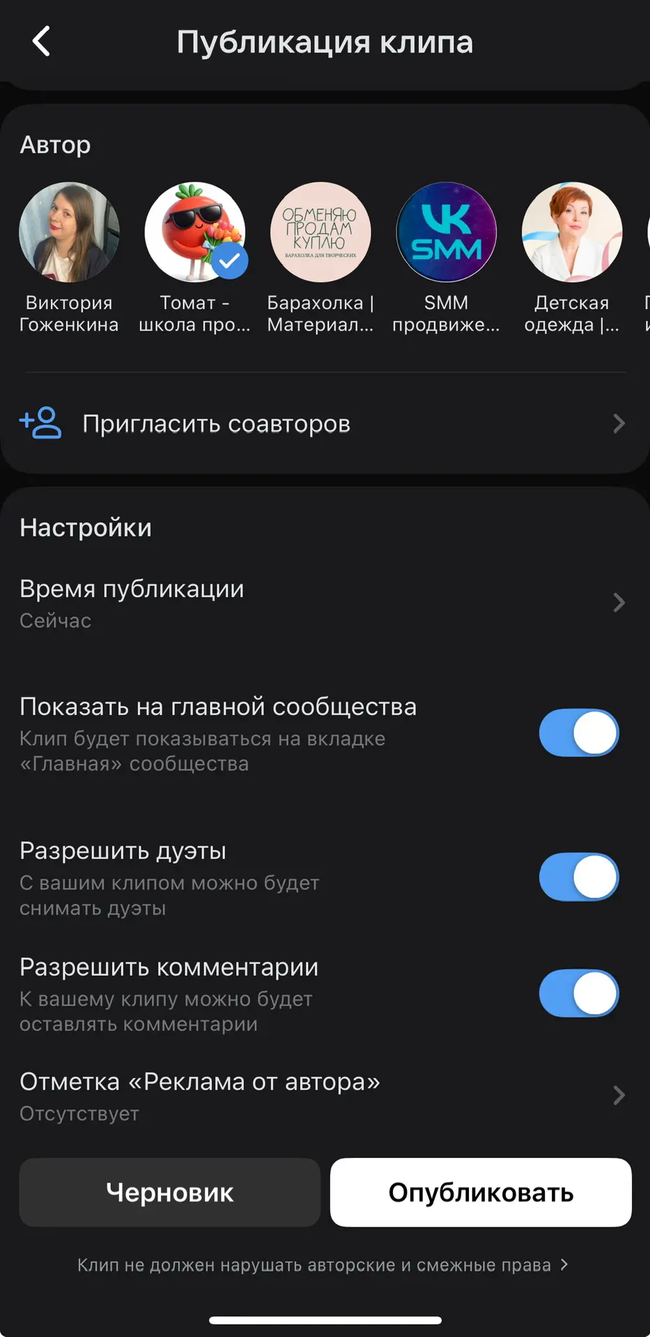 Чтобы клип попал на главную при публикации клипа нужно включить соответствующий ползунок «Показать на главной сообщества».