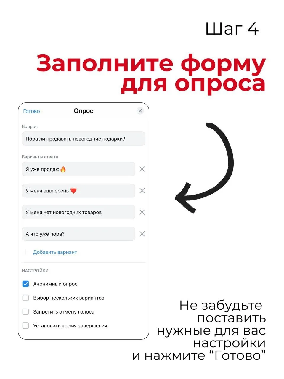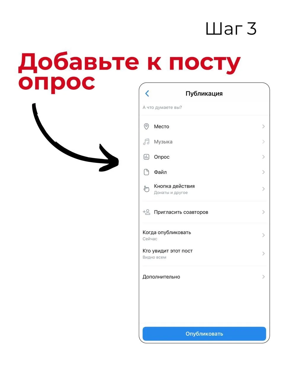 И да, не забывайте комбинировать разные форматы постов и клипы, поэтому опросы нам тут тоже пригодятся.