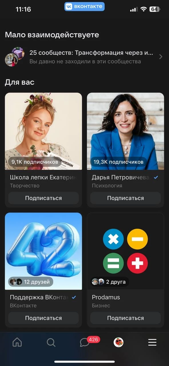 Также в этом разделе показываются сообщества «Для вас», который рекомендует нам ВК.