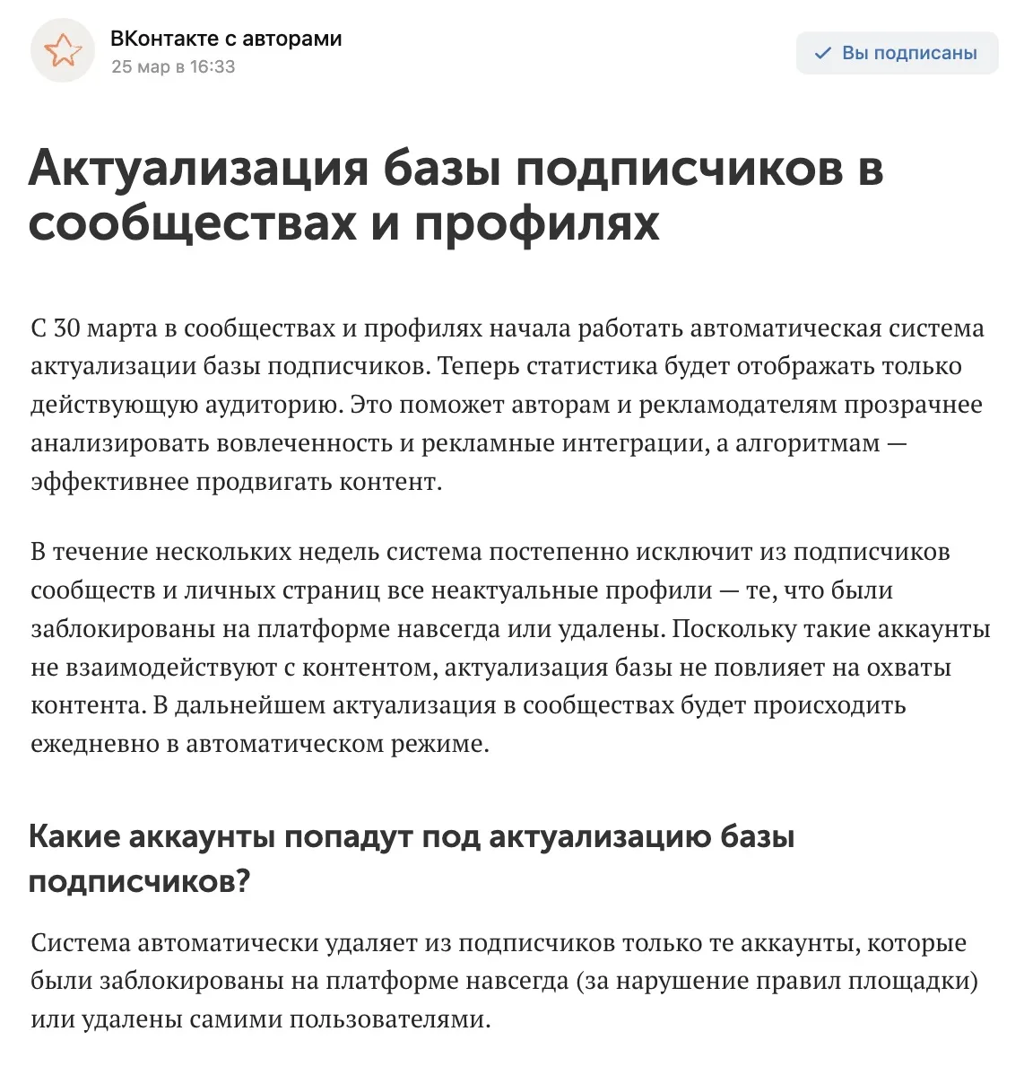 С 30 марта в сообществах и профилях начала работать автоматическая система актуализации базы подписчиков ВКонтакте.