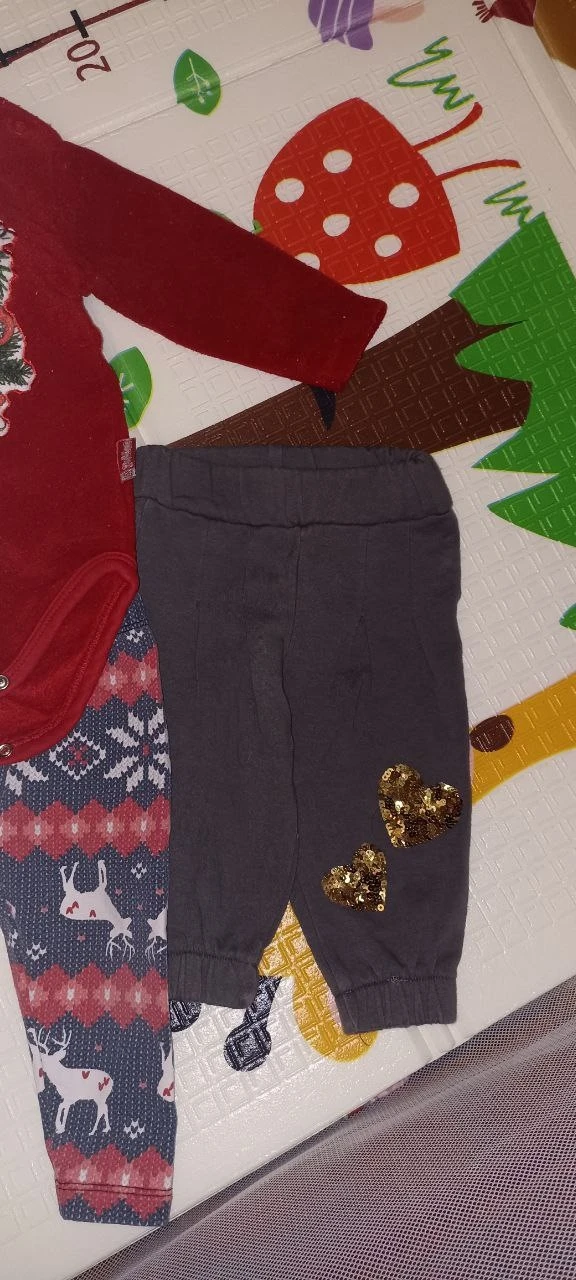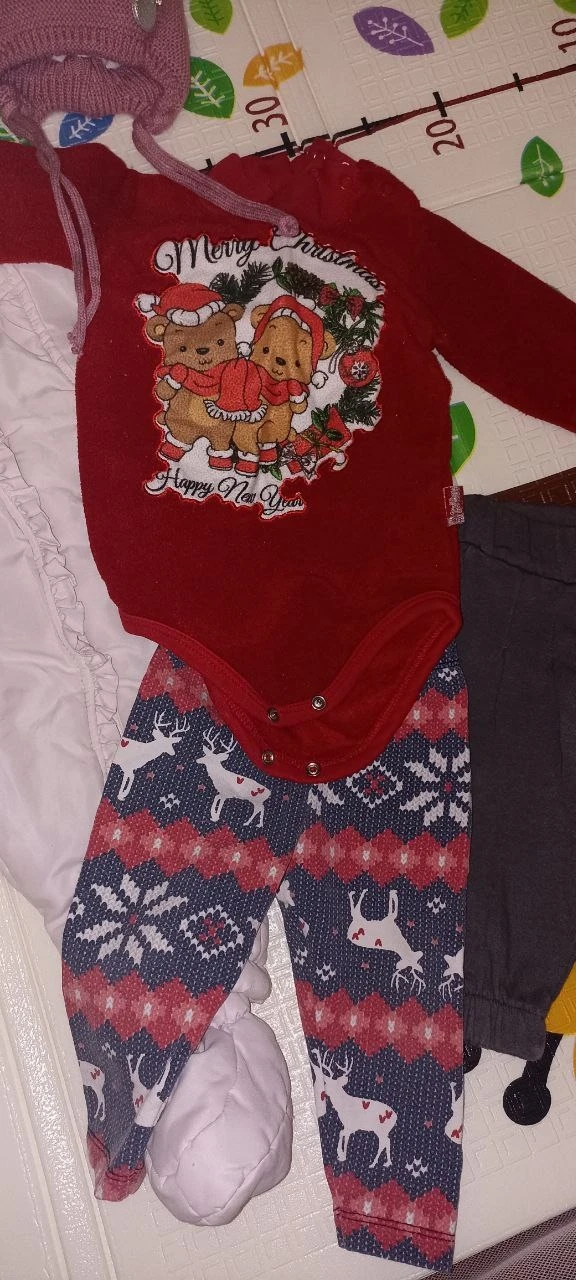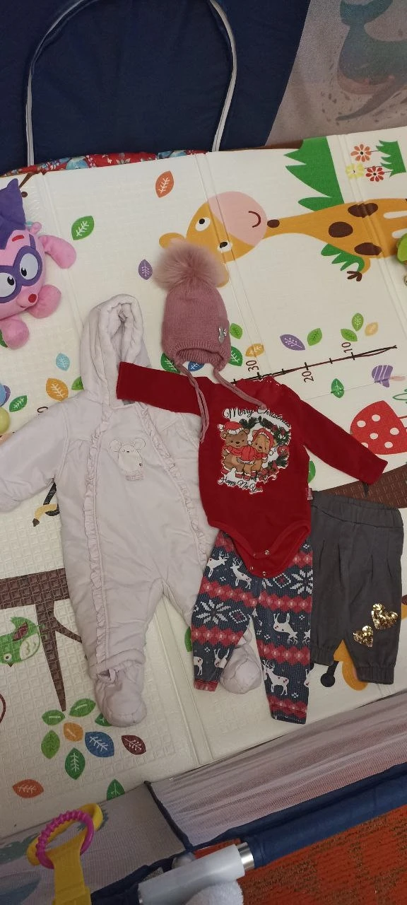 Демисезонный комбез (200 руб.) 👶, тёплая шапка 🧢, утеплённый бодик, лосины и штаны на флисе с сердечками ❤ (любая вещь — 100 руб.).