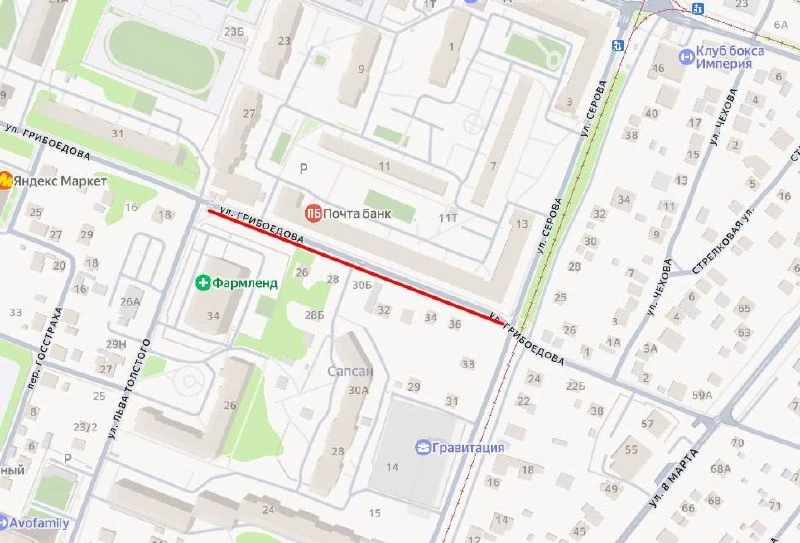 С сегодняшнего дня и до вечера 17 апреля участок улицы Грибоедова будет недоступен для транспорта. Движение закрыто на отрезке от дома №27 по улице Тимирязева до дома №25а по улице Серова.
