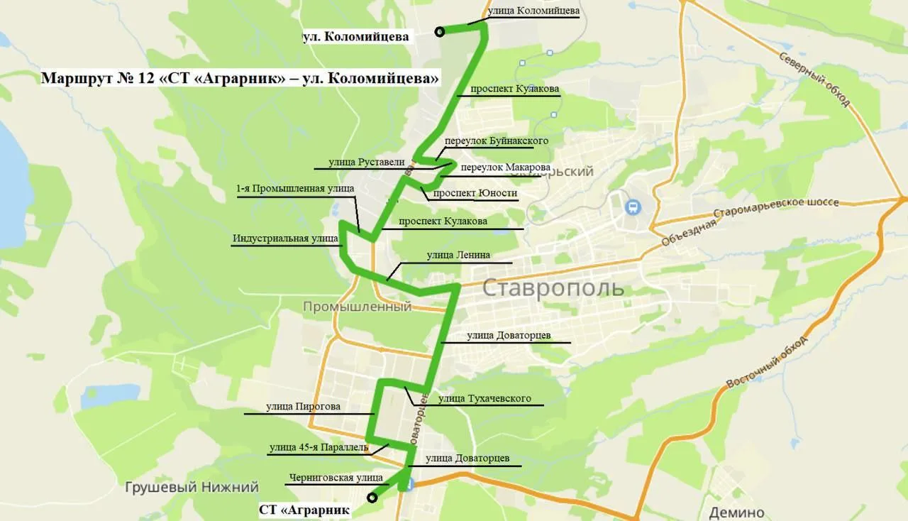 Маршрут №12 будет ходить от СТ «Аграрник» до Коломийцева (10 автобусов с интервалами в 15–20 минут в будни, 20–35 минут — по выходным).