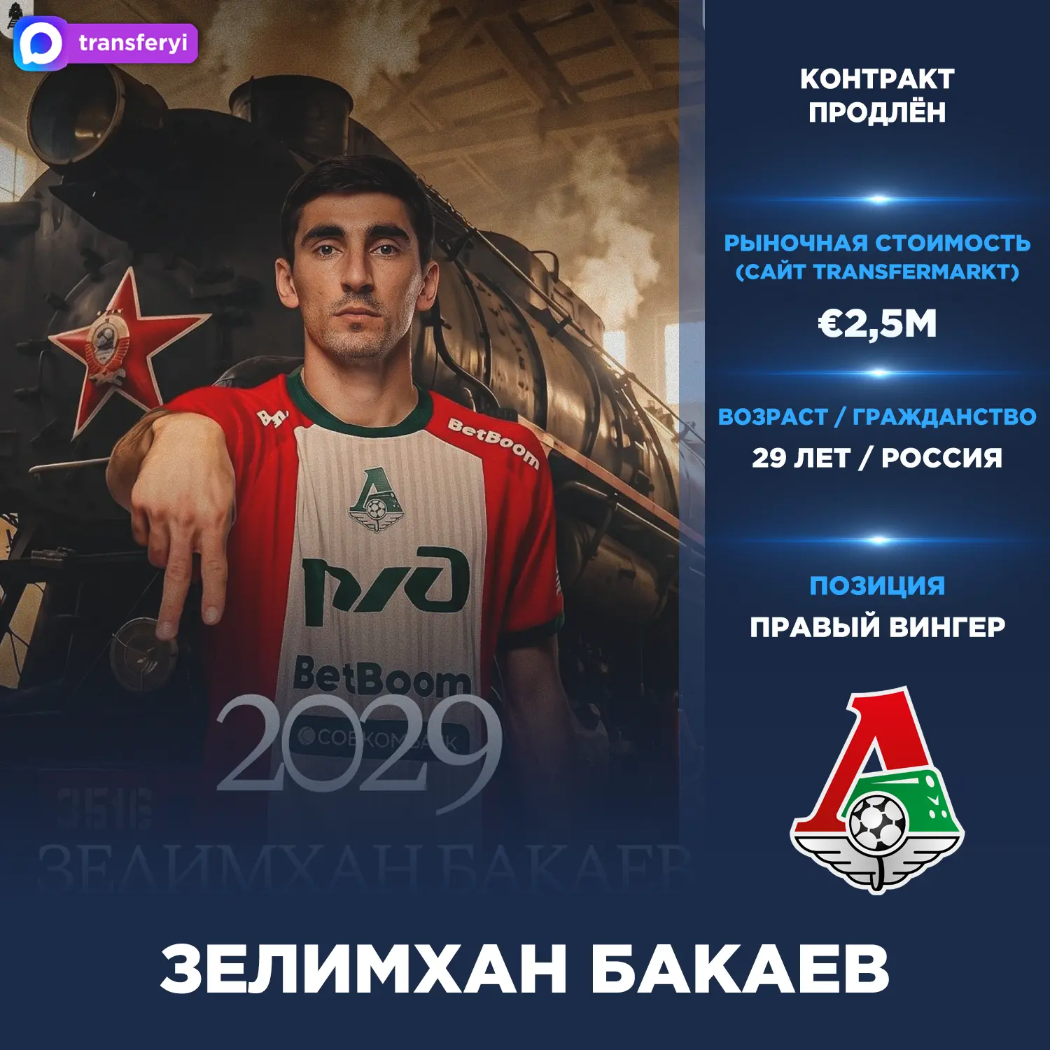 Официально: «Локомотив» продлил контракт с Зелимханом Бакаевым до лета 2029 года.