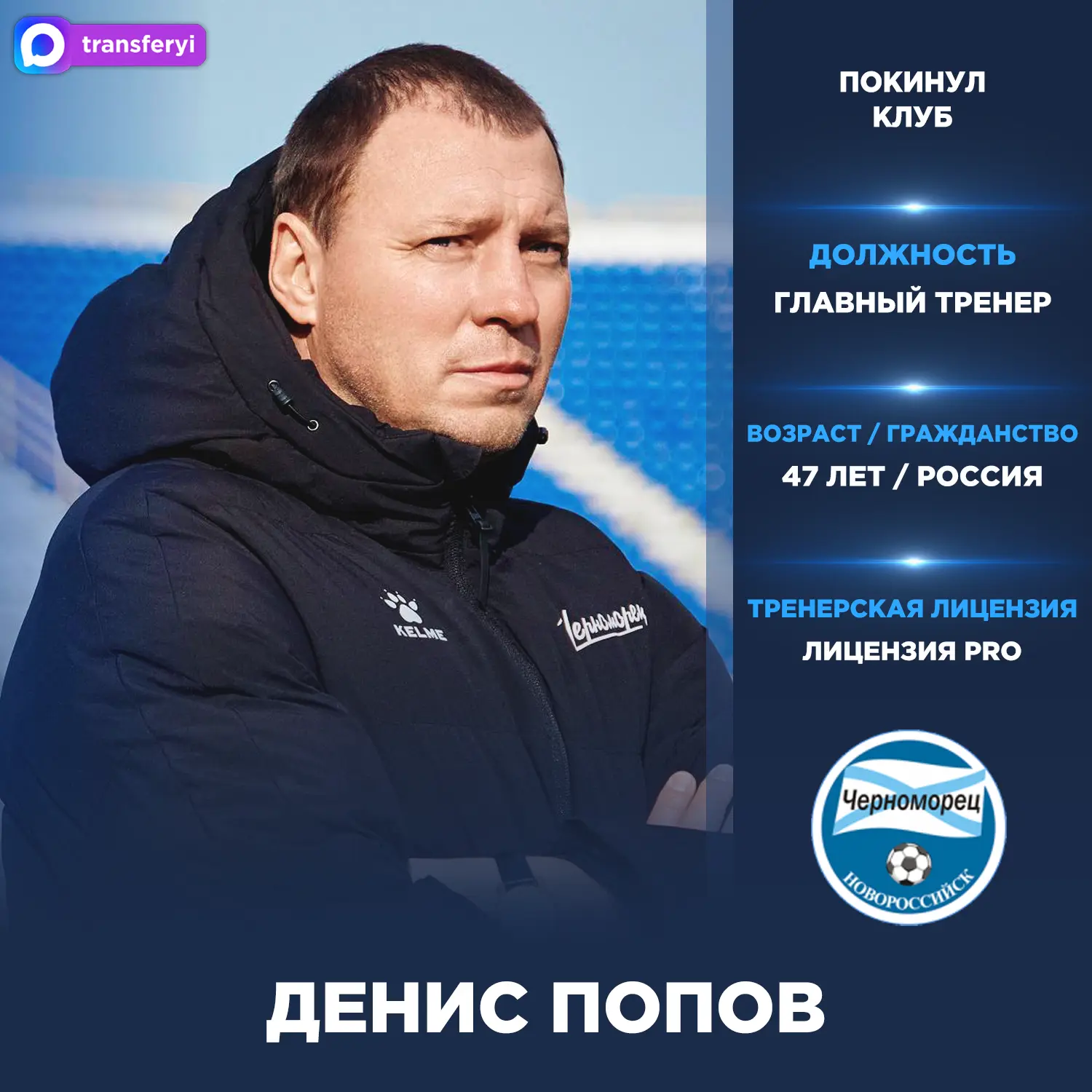 Официально: Денис Попов покинул пост главного тренера «Черноморца Новороссийск».