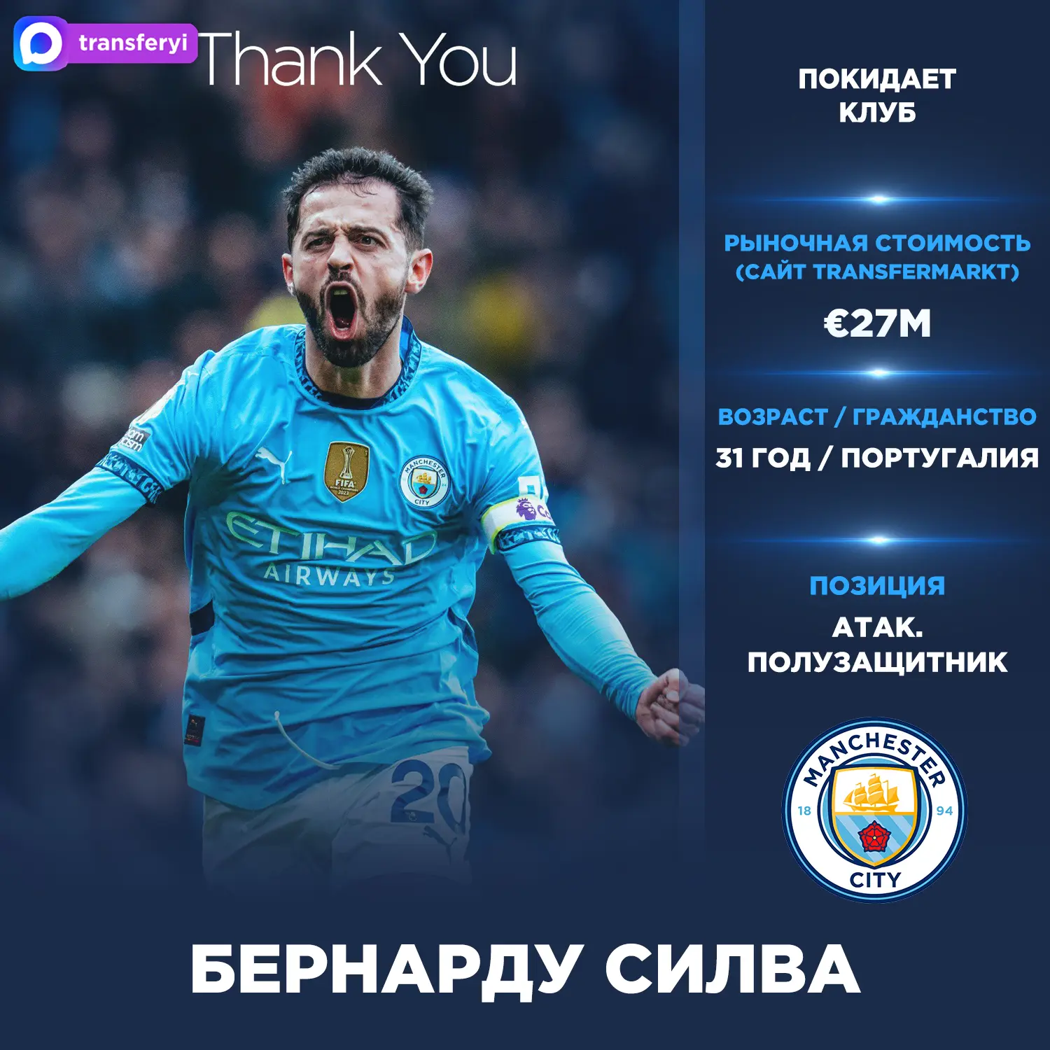 Официально: «Манчестер Сити» подтвердил, что Бернарду Силва покинет клуб этим летом.