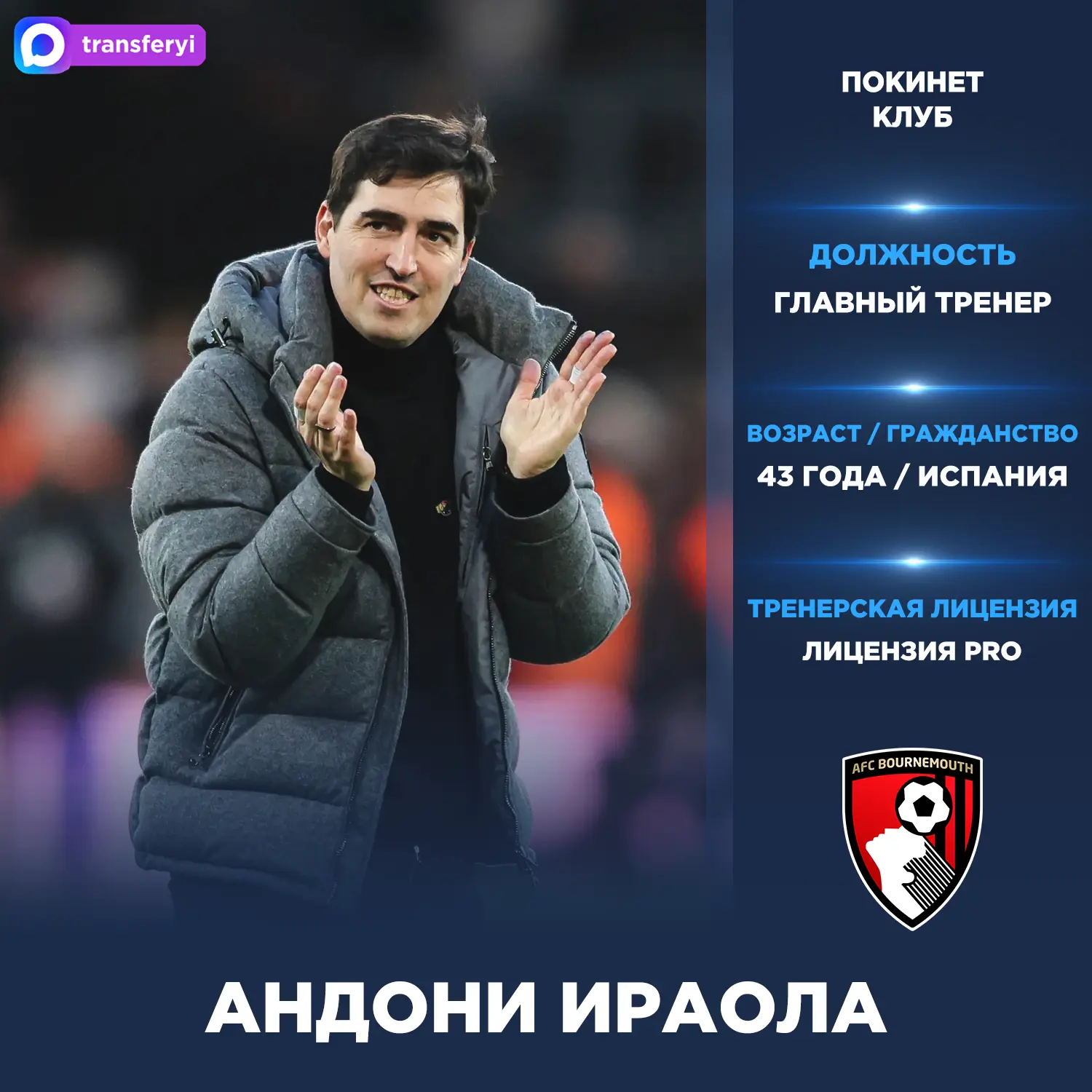 Официально: Главный тренер Андони Ираола покинет «Борнмут» в конце текущего сезона.