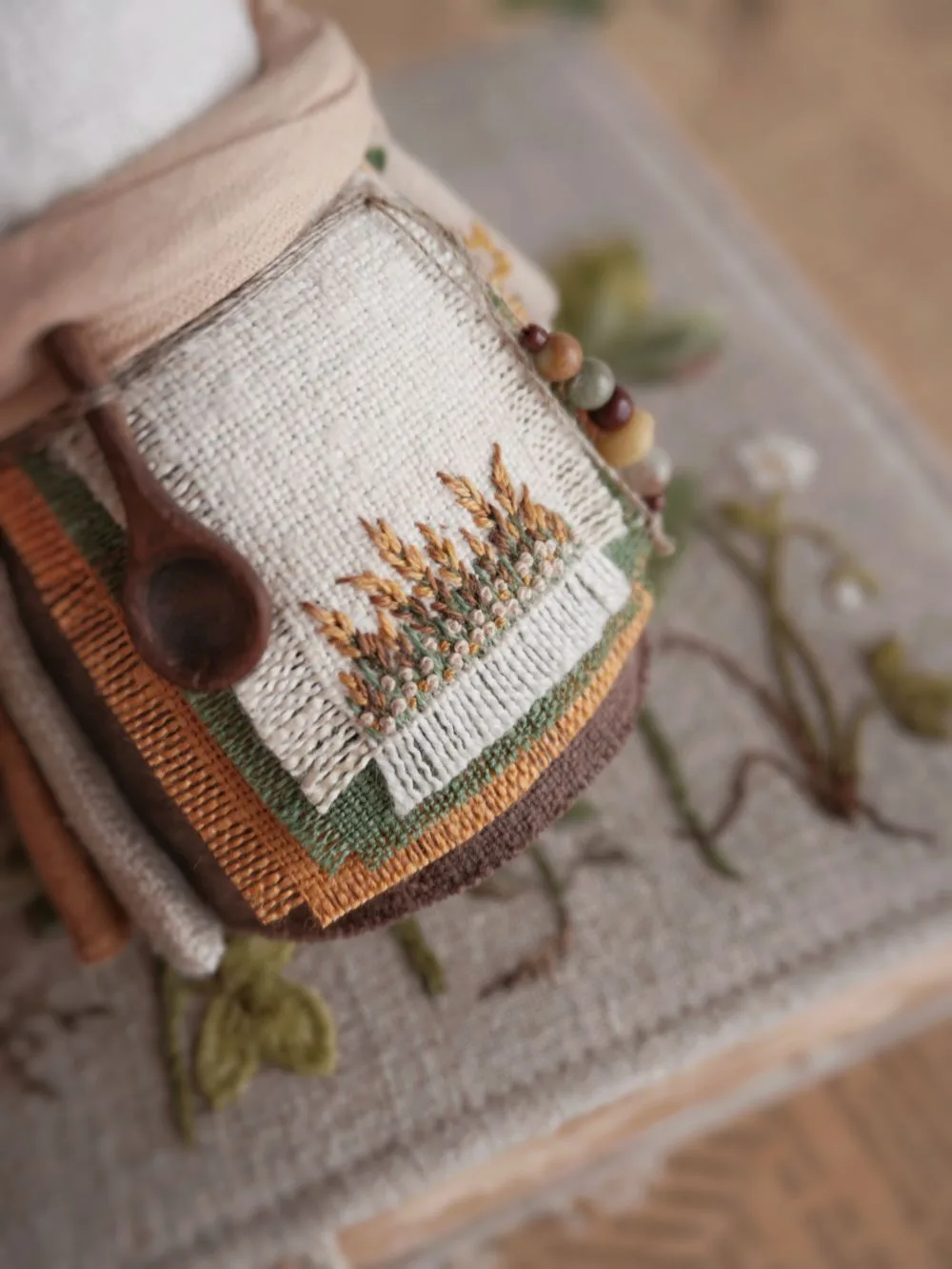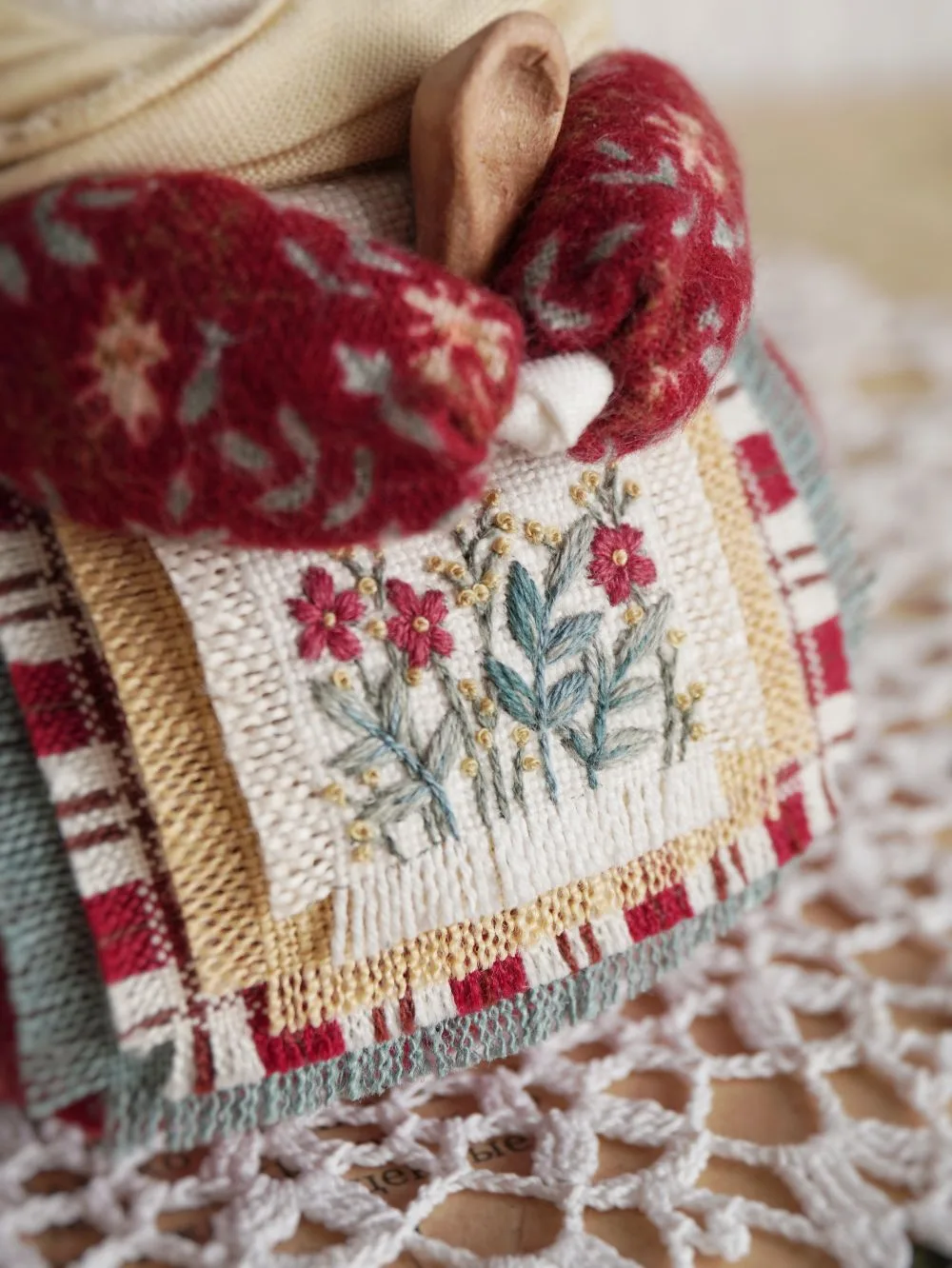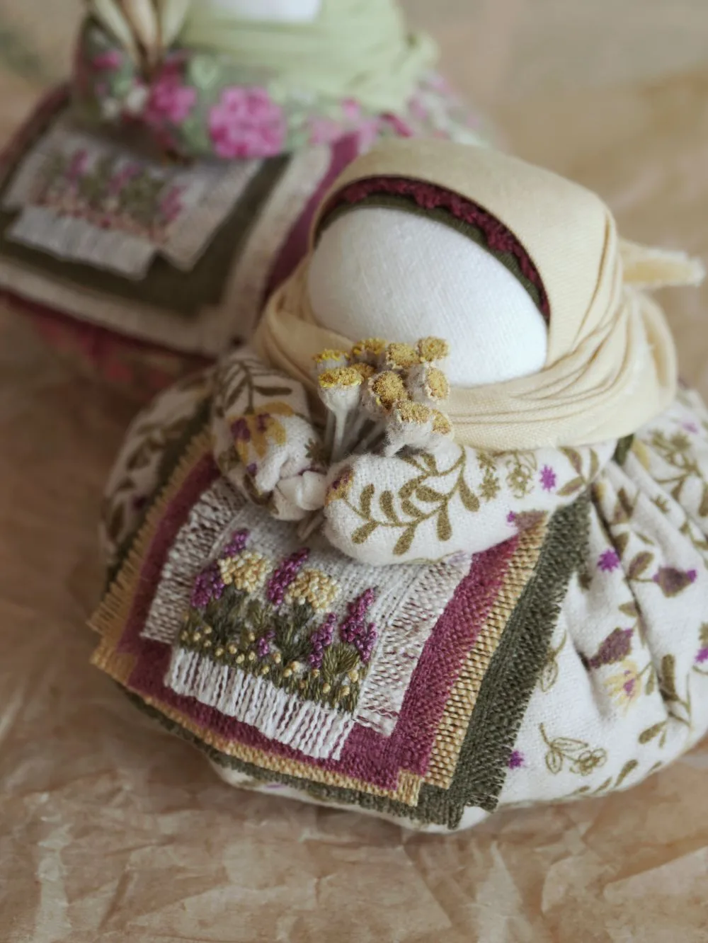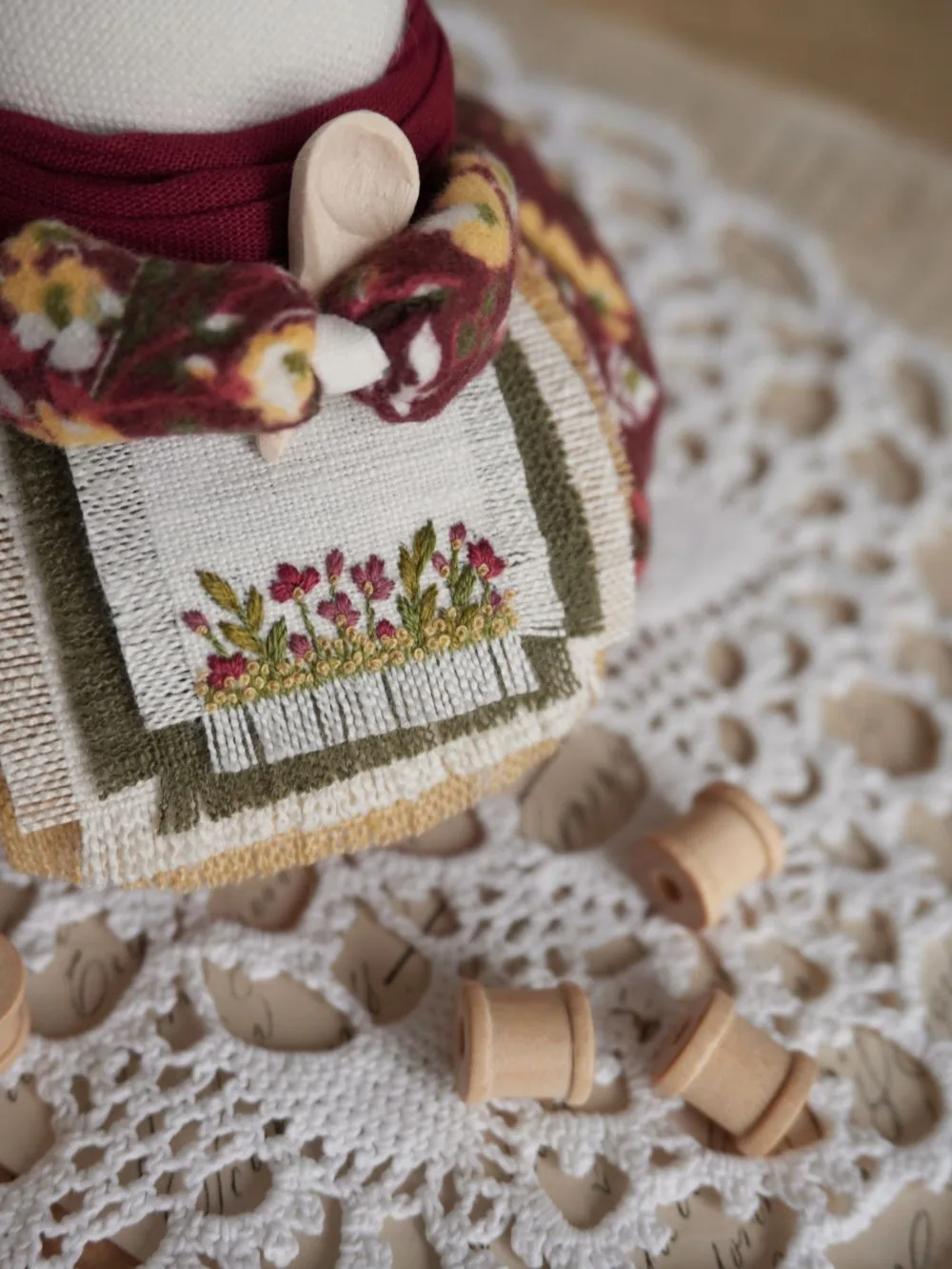 С пополнением тканюшек всегда возникает море идей комбинирования с другими тканями, поэтому это всегда как праздник 🤗🪡 Именно расцветка основной ткани куколки задаёт идею наряда, а оттенки ниток для передничка подбираю ей в тон. А дальше - волшебство вышивки - микро-полянки рождаются уже сами собой! ✨