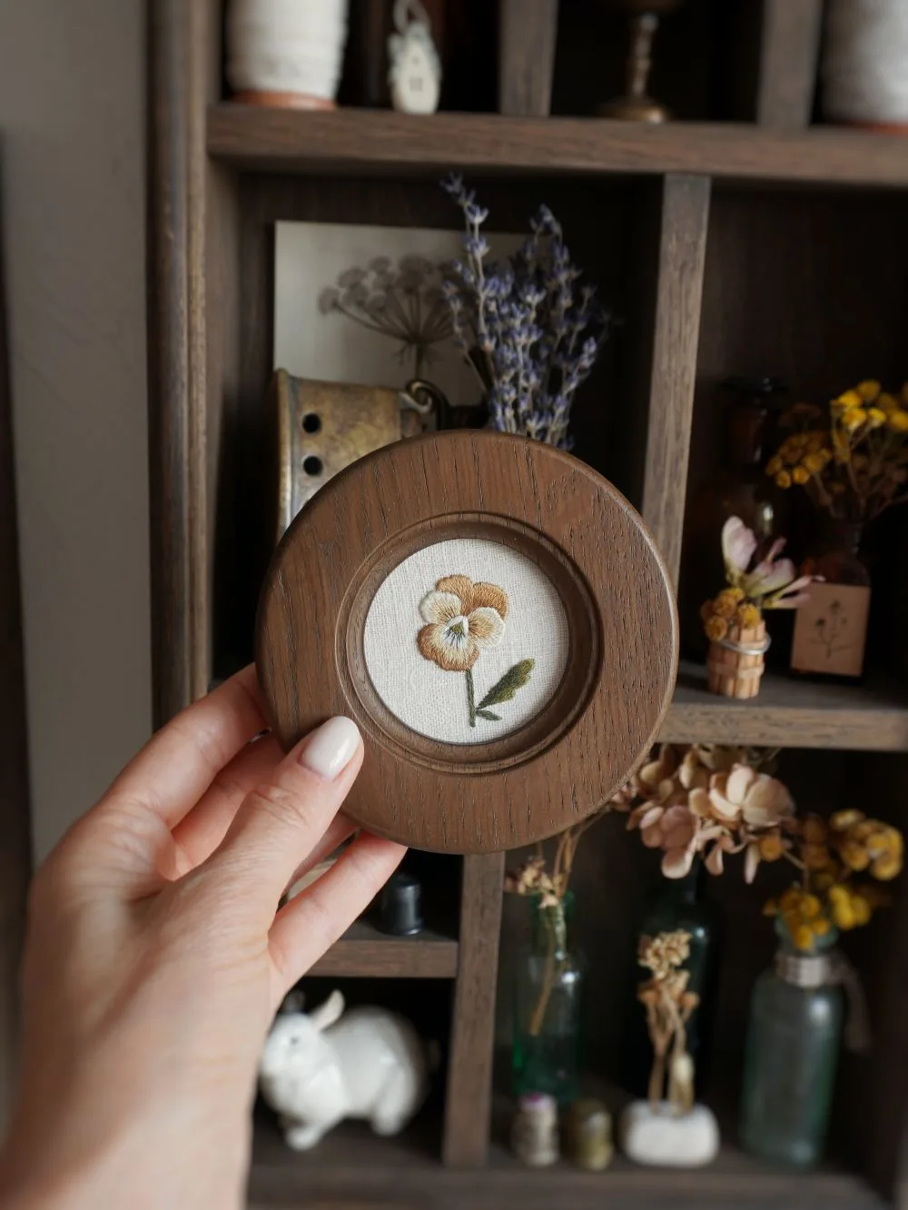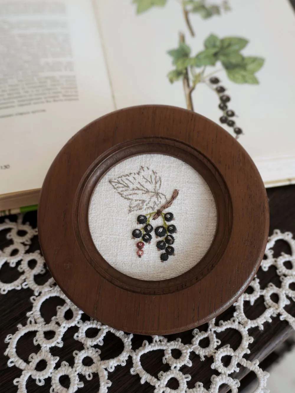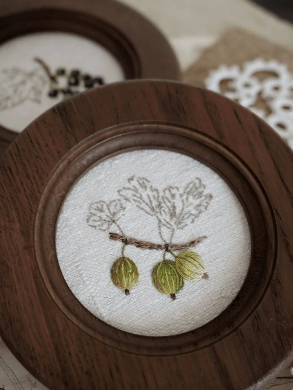 Изначально планировала сделать с этой вышивкой салфетки для декора банок. Но могу и так оформить - в дубовые рамочки (внешний диаметр 11,5 см).