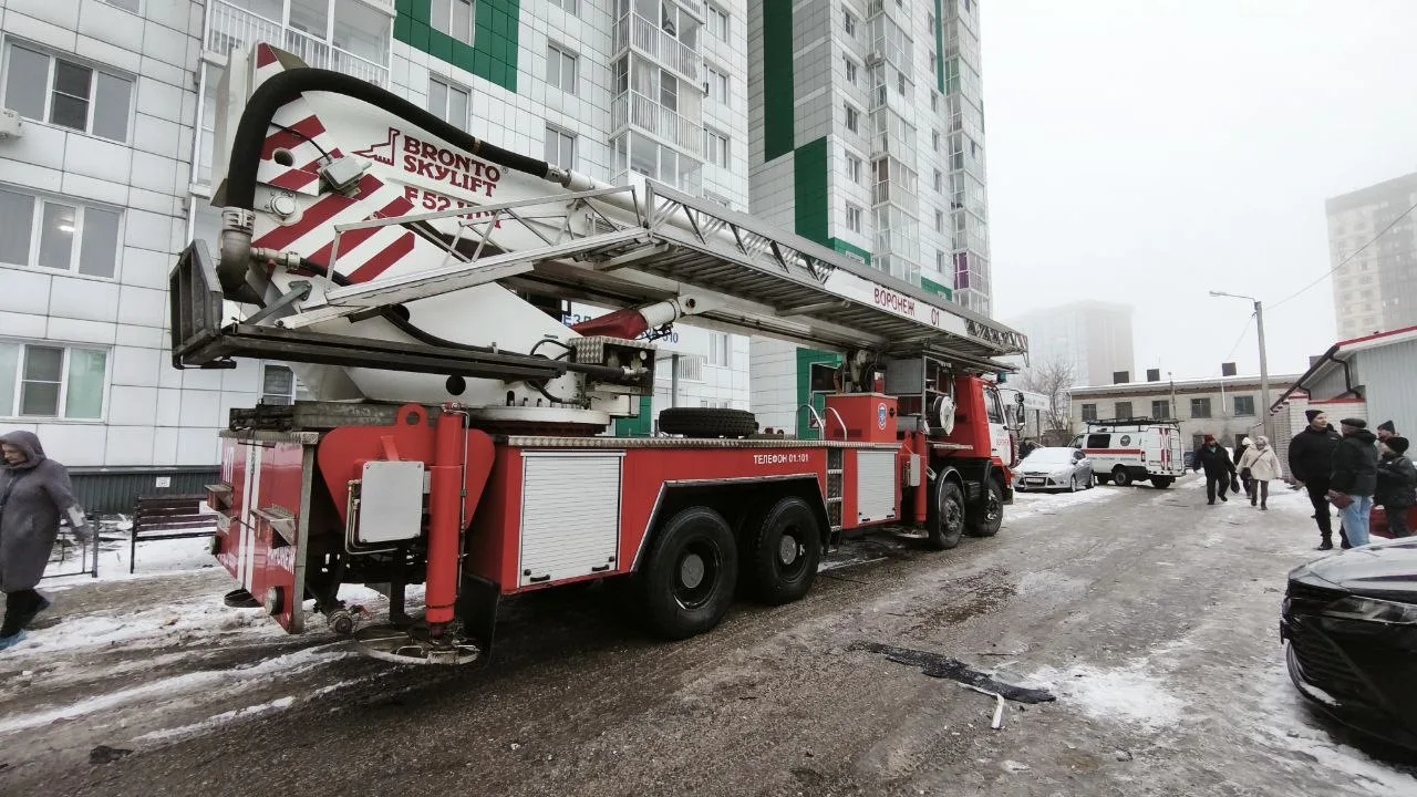 В одном из районов к пострадавшей высотке приехали пожарные машины — по лестнице специалисты забрались в пострадавшую квартиру. Там осматривают повреждённые балкон и окна.