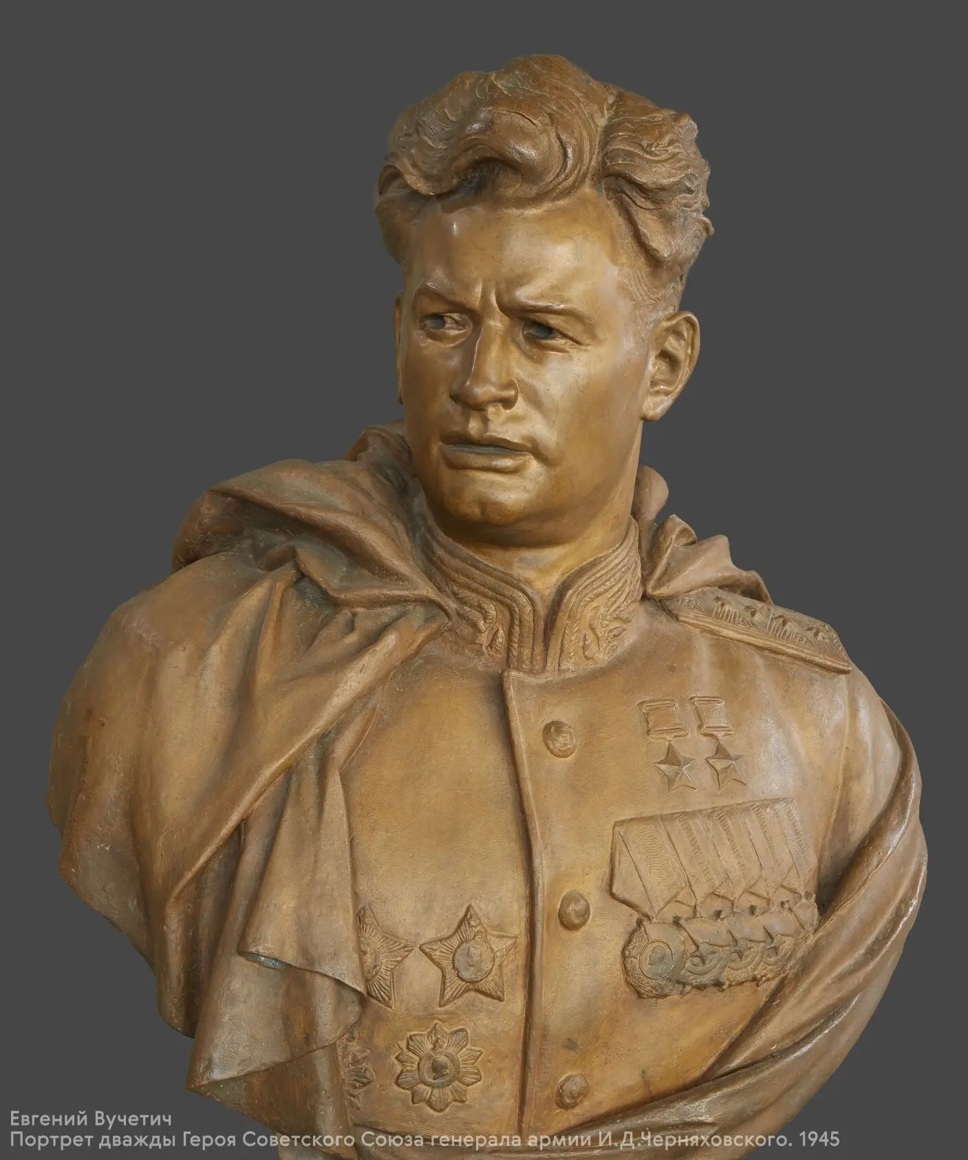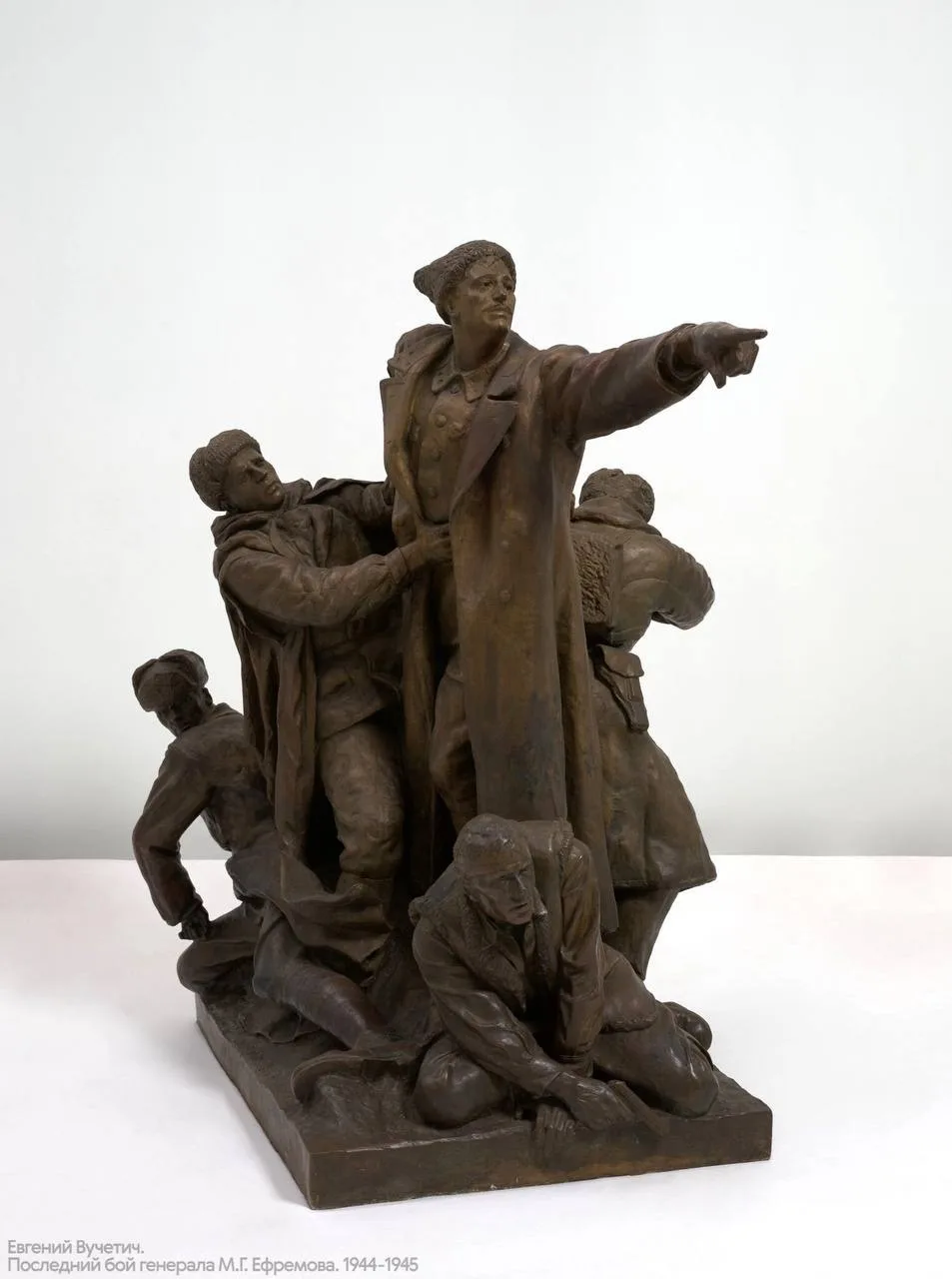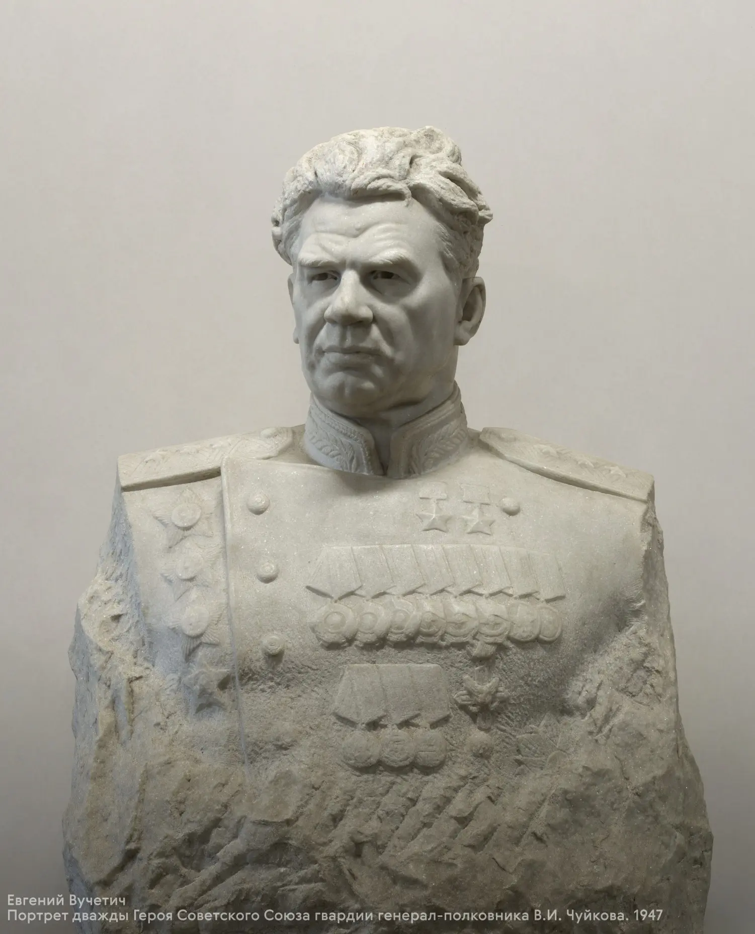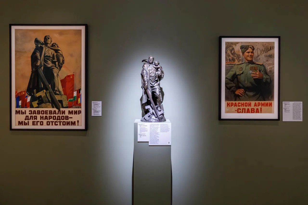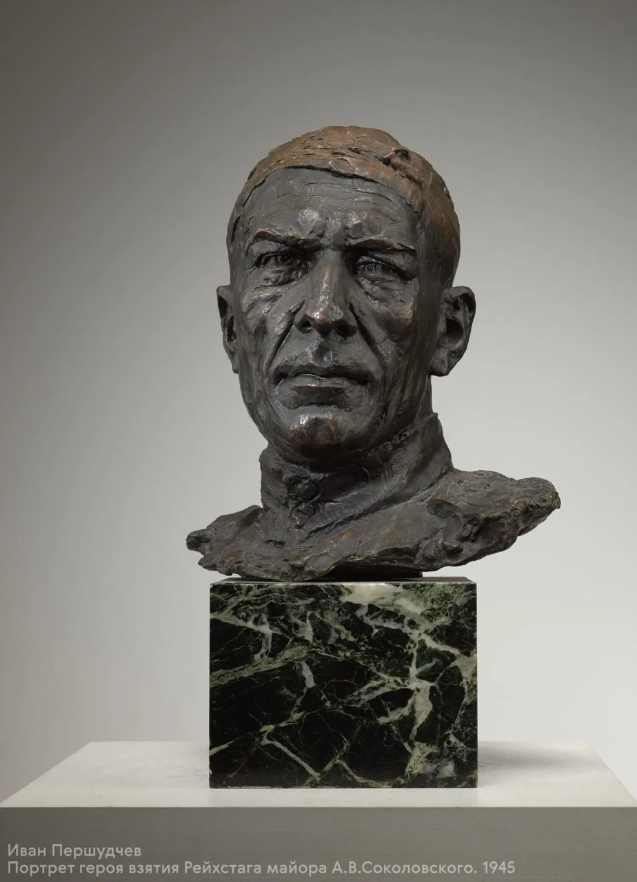 На выставке «1418 дней. К 80-летию Великой Победы» представлены исполненные скульптором образы советских воинов, водрузивших знамя Победы над Рейхстагом – сержантов Михаила Егорова и Мелитон Кантария, а также заместителя командира полка, штурмовавшего Рейхстаг, майора Александра Соколовского. Майор Соколовский в ходе ожесточенного боя получил осколочное ранение в голову. Сразу после боя и был создан портрет. На голове у героя повязка, сделанная наспех, не руками санитаров, а товарищами по последнему победному сражению.