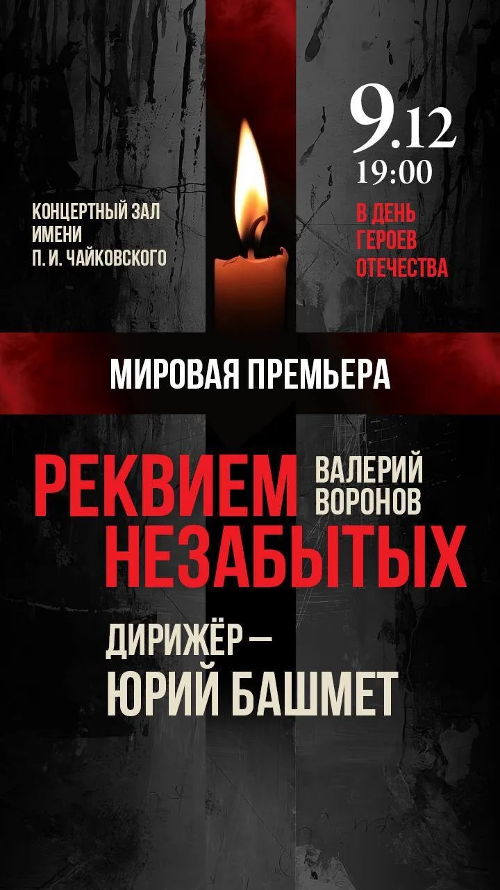 9 декабря, в День Героев Отечества, в Концертном зале имени П.И. Чайковского состоится событие, объединившее музыку и изобразительное искусство: премьера «Реквиема Незабытых» композитора Валерия Воронова.