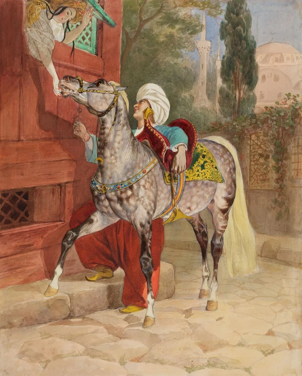 В акварели «Любовное свидание в Константинополе» художник запечатлел трогательный момент: молодой человек в ярком наряде, стоя под окном, влюбленным взглядом смотрит на красавицу турчанку. Она же, приоткрыв ставни, изящным жестом угощает коня своего возлюбленного. Брюллов мастерски использовал богатую цветовую палитру и с особой точностью изобразил грациозного скакуна в восточном убранстве. Все действие разворачивается на фоне типичного турецкого пейзажа с кипарисами и очертаниями мечети и минаретов на заднем плане.