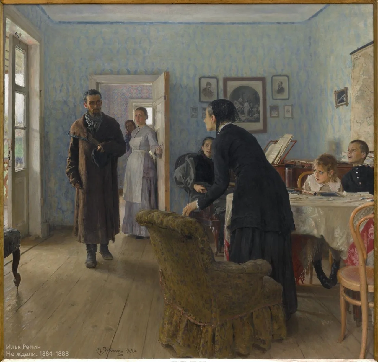 Картина Ильи Репина «Не ждали» занимает одно из важнейших мест в истории русской художественной культуры XIX века. Картина была экспонирована на 12-й выставке Товарищества передвижных художественных выставок в 1884-м году, вызвала большой интерес зрителей и бурную дискуссию в печати. Несмотря на это, Репин был недоволен образом главного героя и продолжал работать над произведением. Сегодня «Не ждали» имеет двойную дату – 1884-1888 годы – и за ней скрывается непростая история создания.