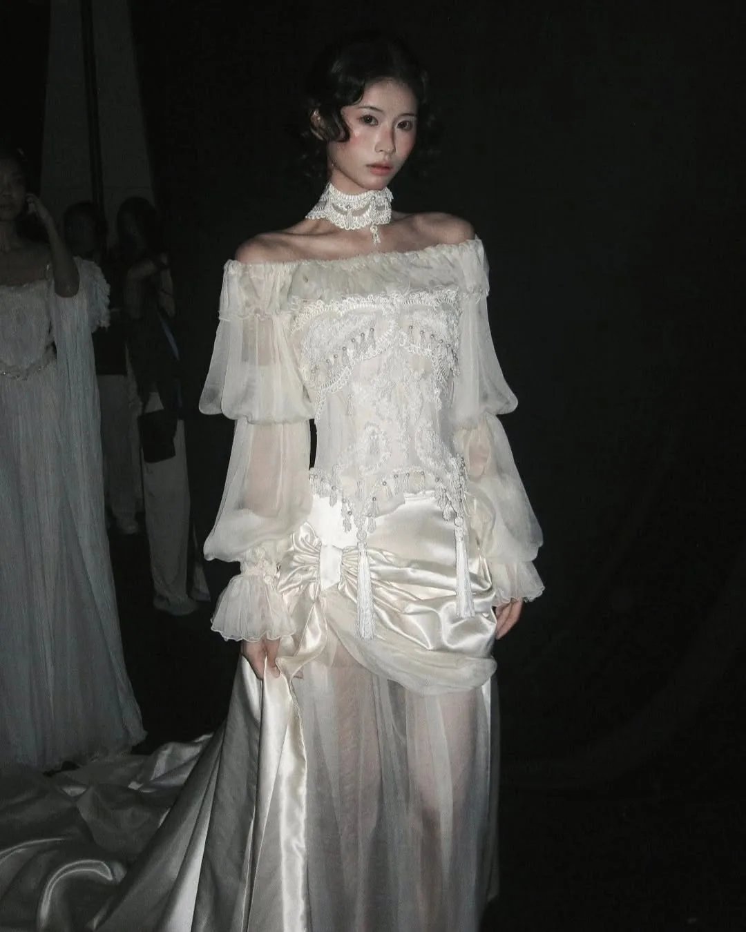 За кулисами, овеваемые морским бризом, каждый слой тюля и каждый стежок незаметно рассказывают историю неповторимого сияния невесты.
