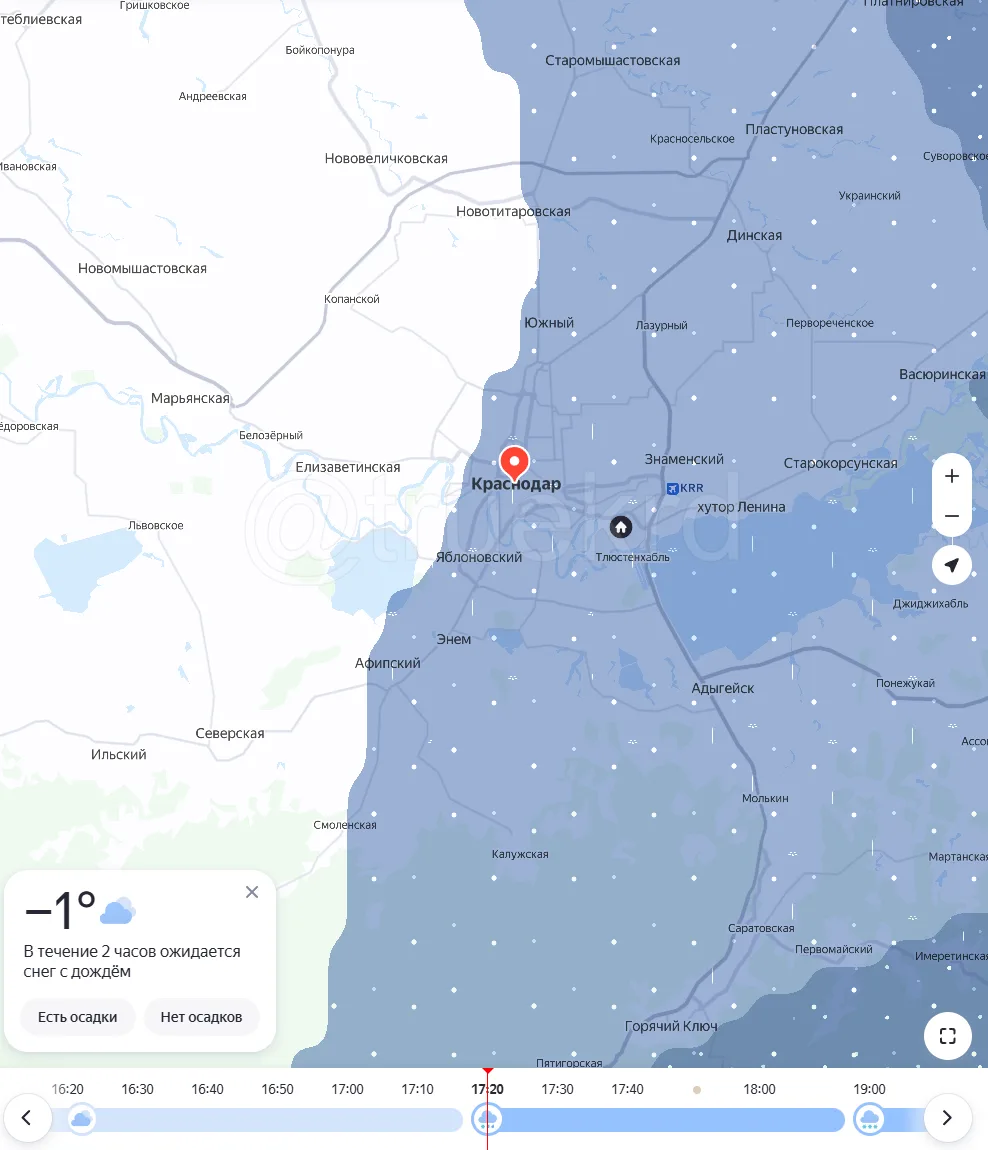 ❄ Согласно картам осадков Краснодар с 17:00 накроет мощный снегопад, который продлиться до 7 часов утра.