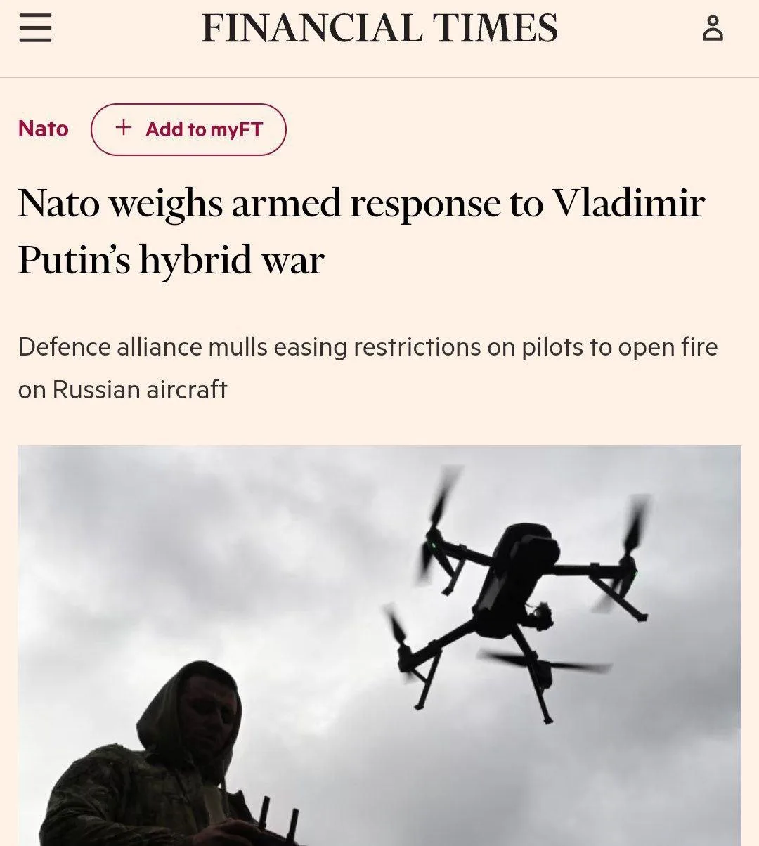 Financial Times сообщает о том, что в альянсе обсуждается возможность проведения военных маневров на границе с Россией и ослабления правил для пилотов, а именно - разрешить открывать огонь по русским самолетам и дронам.