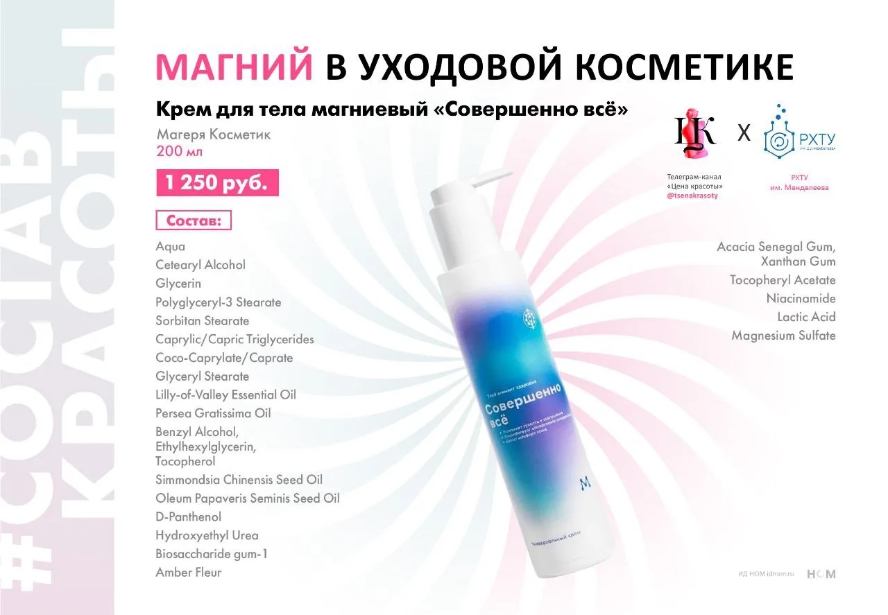 Забота о благополучии нервной системы – глобальный тренд рынка велнеса, а магний известен своим успокаивающим и балансирующим действием. Сегодня поговорим о бренде, маркетинг и формулы которого базируются именно на этом микроэлементе. Совместно с экспертами Кафедры технологии химико-фармацевтических и косметических средств (ТХФ и КС) РХТУ им. Менделеева мы разобрали #составкрасоты магниевого крема для тела "Совершенно всё" от "Магеря Косметик". Продукт в объёме 200 мл. стоит 1 250 руб.