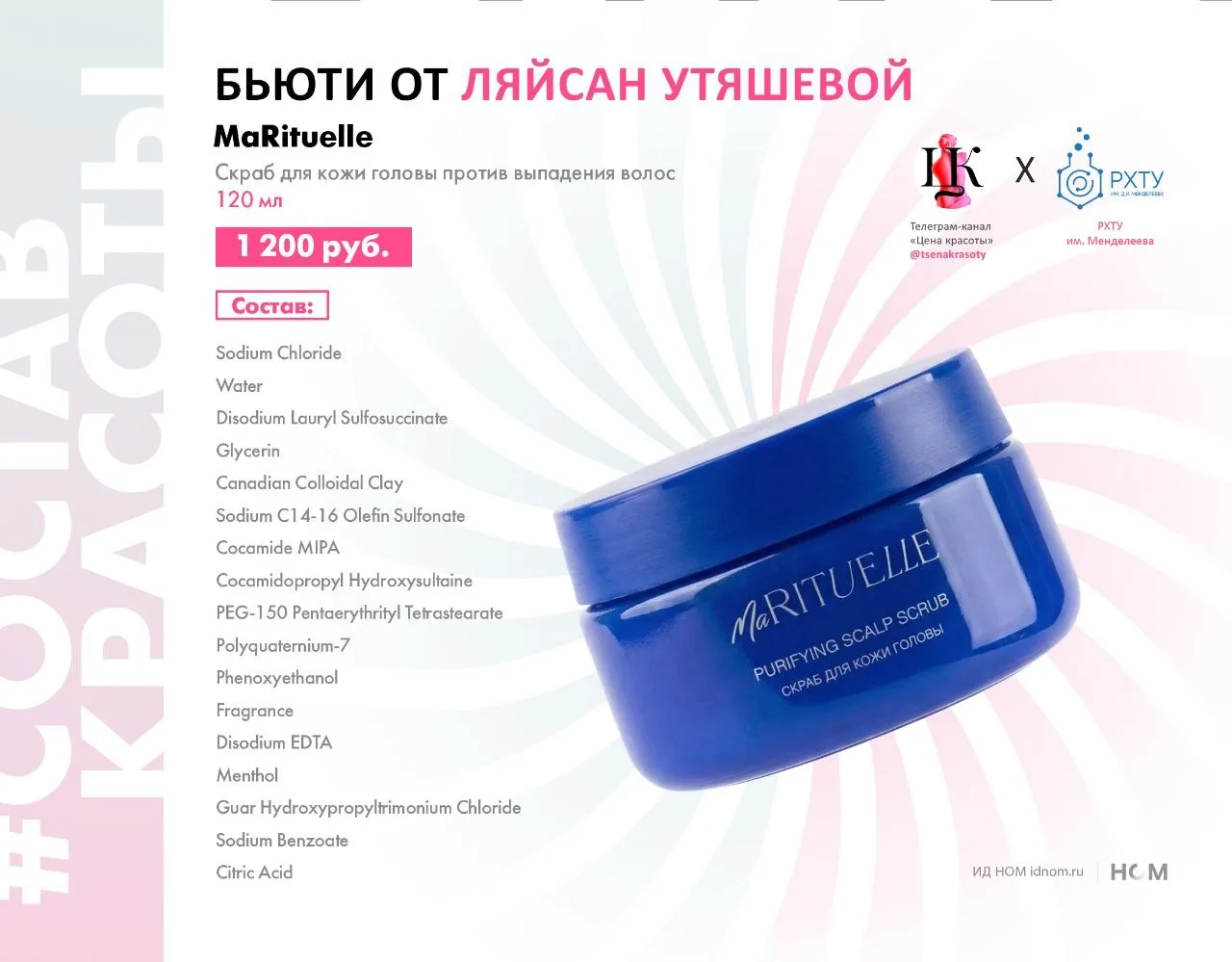 В середине марта Ляйсан Утяшева и Павел Воля синхронно дебютировали на бьюти-рынке, и мы решили рассмотреть этот запуск в деталях. Совместно с экспертами Кафедры технологии химико-фармацевтических и косметических средств (ТХФ и КС) РХТУ им. Менделеева мы разобрали #составкрасоты скраба для кожи головы против выпадения волос от MaRituelle – бренда Ляйсан Утяшевой. Цена продукта – 1 200 руб. за 120 мл.